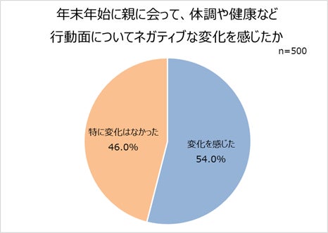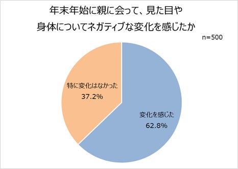また、年末年始に帰省して親に会った際に、親に対して感じた変化については、見た目や身体についてネガティブな変化を感じた人は6割以上いました。具体的には「白髪が増えた」、「顔のしわ・たるみが増えた」、「体が小さくなった」などの意見があり、体調や健康など行動面においても、半数以上の人がネガティブな変化を感じています。具体的には「動作が遅くなった」、「歩くのが遅くなった」、「体のどこかが痛いと言うようになった」と3割以上の人が回答しました。