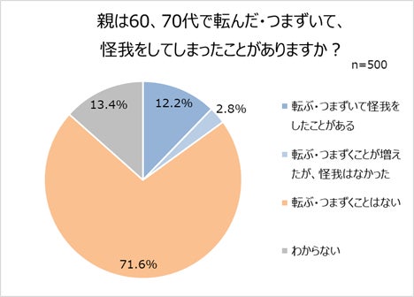 転んだりつまずいたりすることは、筋力(速筋)の低下が一因にもなっているといわれますが、実際に親が60~70歳代で「転ぶ・つまずいて怪我をしたことがある」という人は1割程度でした。しかし、今後加齢によって筋力が低下すると転倒などのリスクが高まることが懸念されます。
