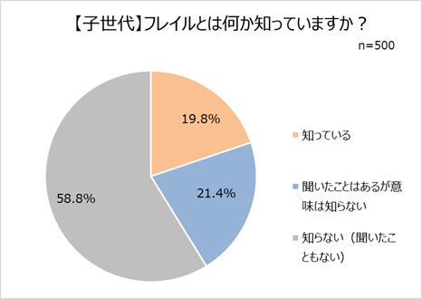 このフレイルについて子世代の認知度を調査したところ、「知っている」と回答した人は2割未満で、「フレイルは聞いたことはあるが意味は知らない」、「知らない(聞いたこともない)」と回答した人は約8割でした。