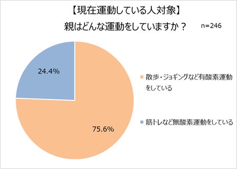 親が「運動している」と回答した子世代は約半数。そのうち7割以上が散歩・ジョギングなどの有酸素運動を実施、一方で筋トレなど無酸素運動の実施は少数派の約2割でした。