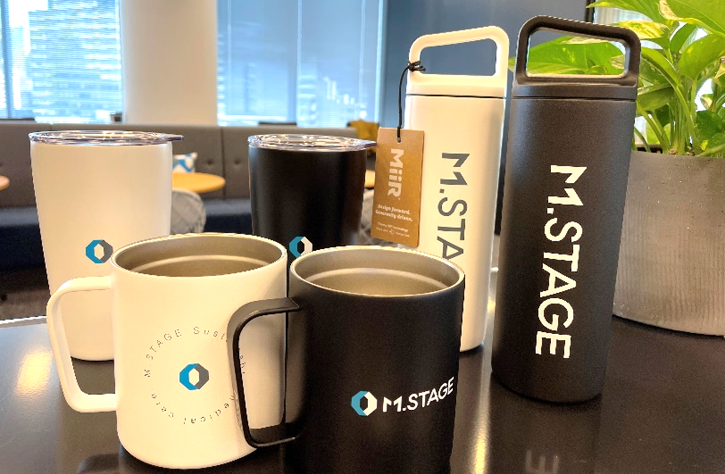 そこで新たな取り組みとして、全社員にオリジナルマイボトルを配布し、使い捨てカップの利用を廃止しました。ご来社いただいたお客さまにも、オリジナルマグカップにてお飲み物の提供を行い、これにより年間2万4千枚の使い捨てカップを削減します。