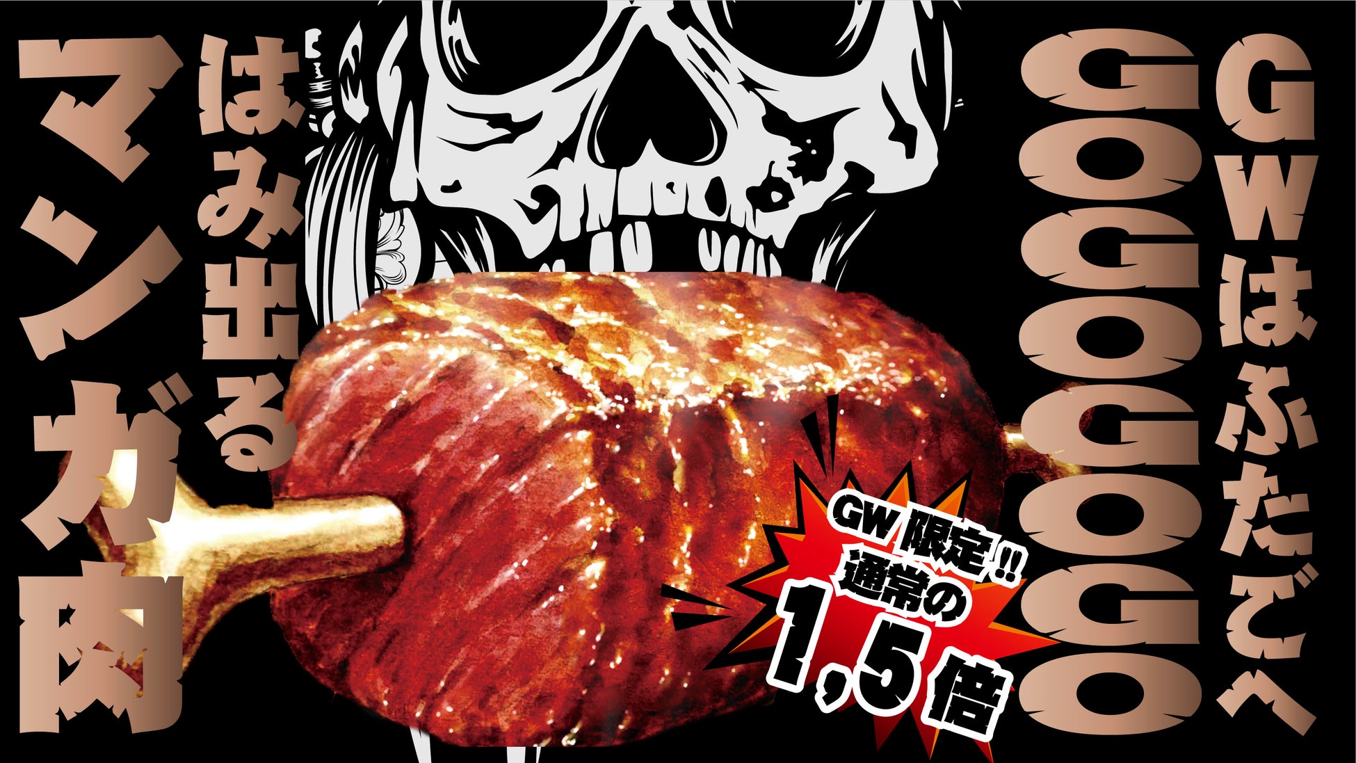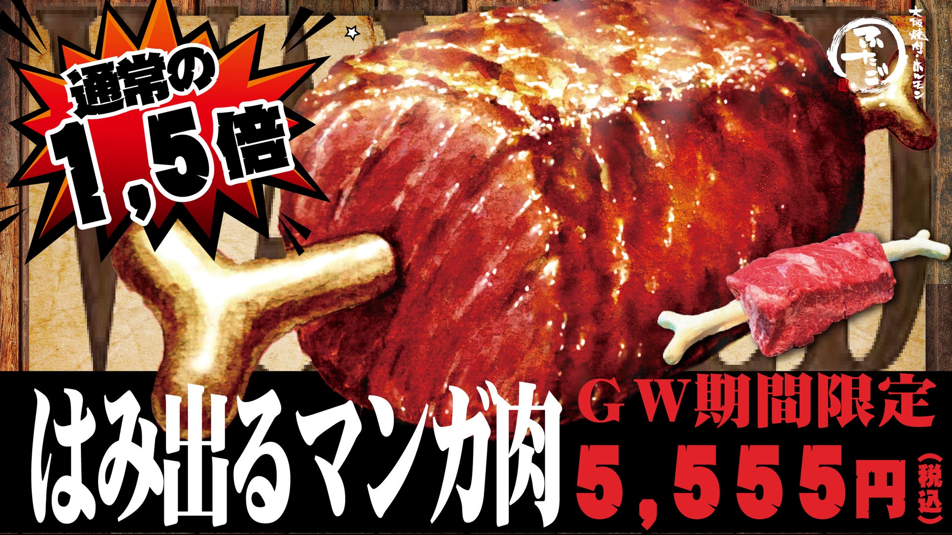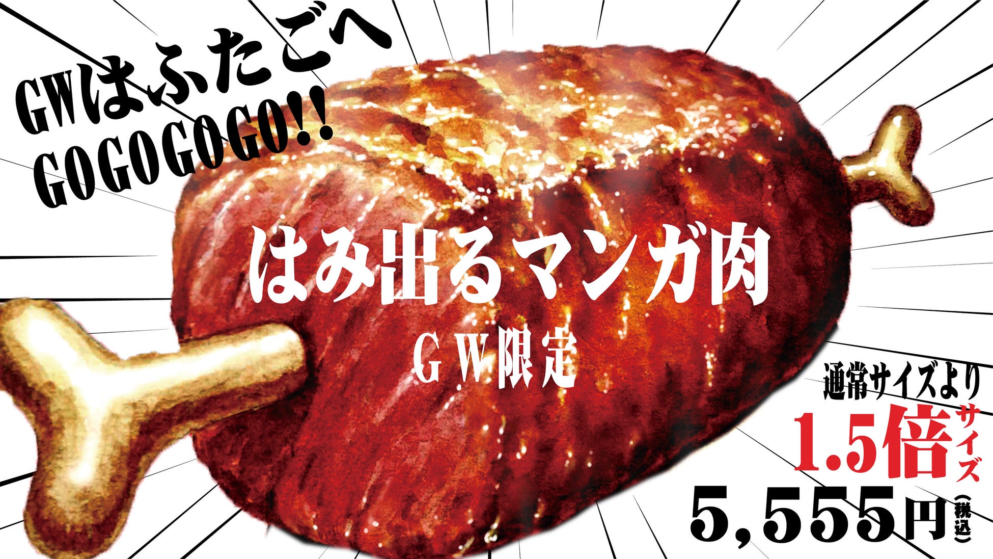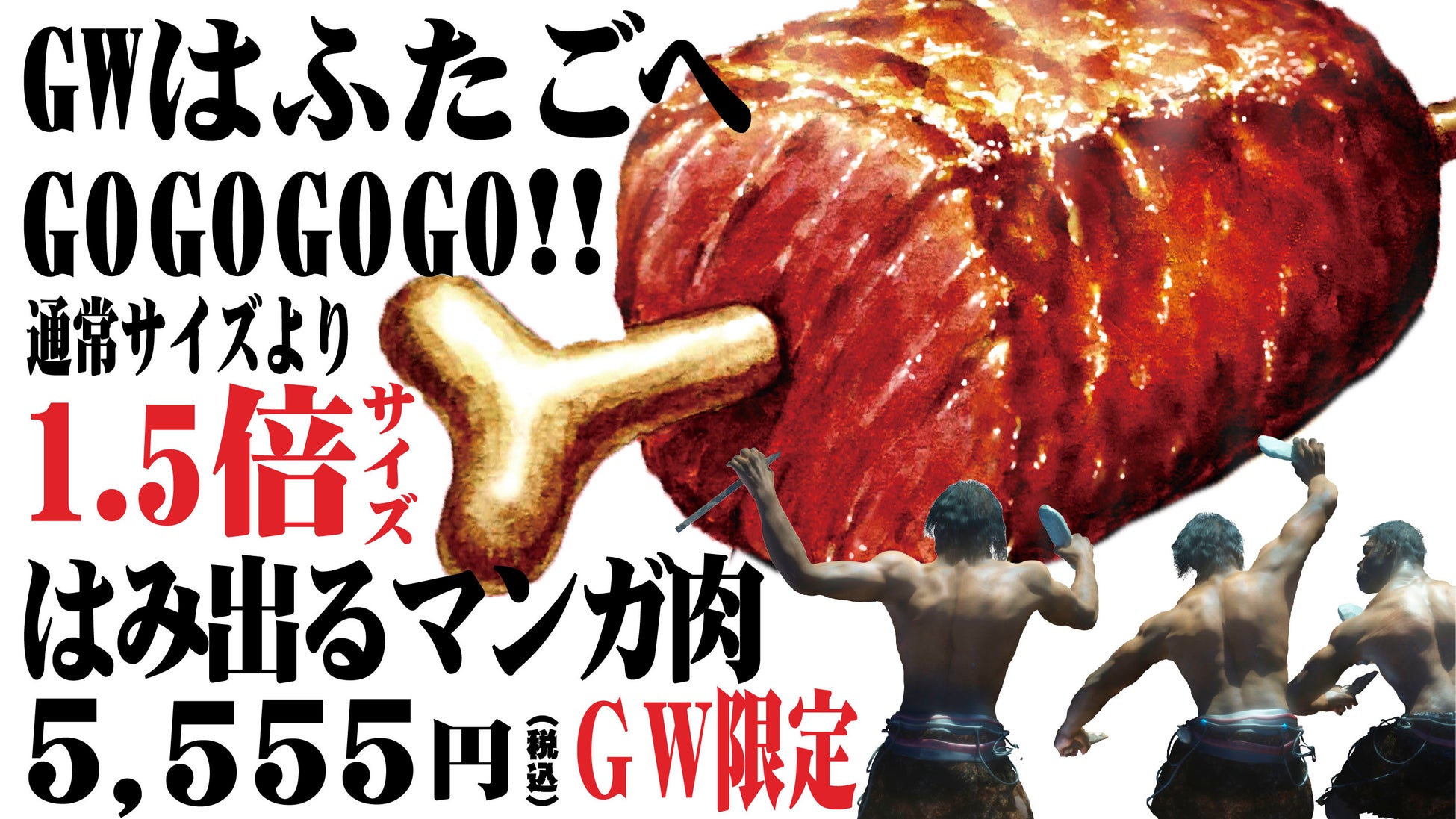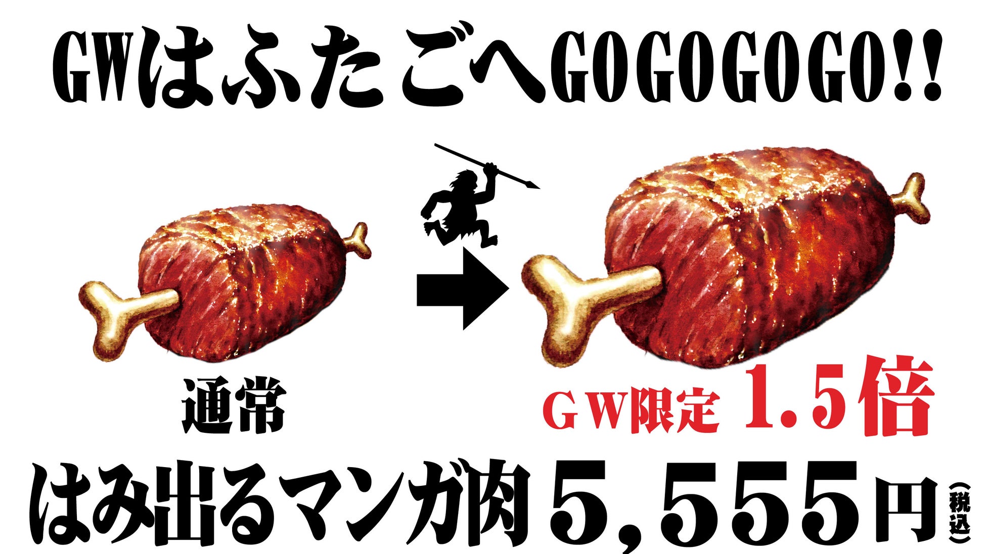 SNS映え必至で話題のマンガ肉がGW限定でさらに巨大化!ふたご史上最重量「1.5倍“はみ出る”マンガ肉」爆誕!