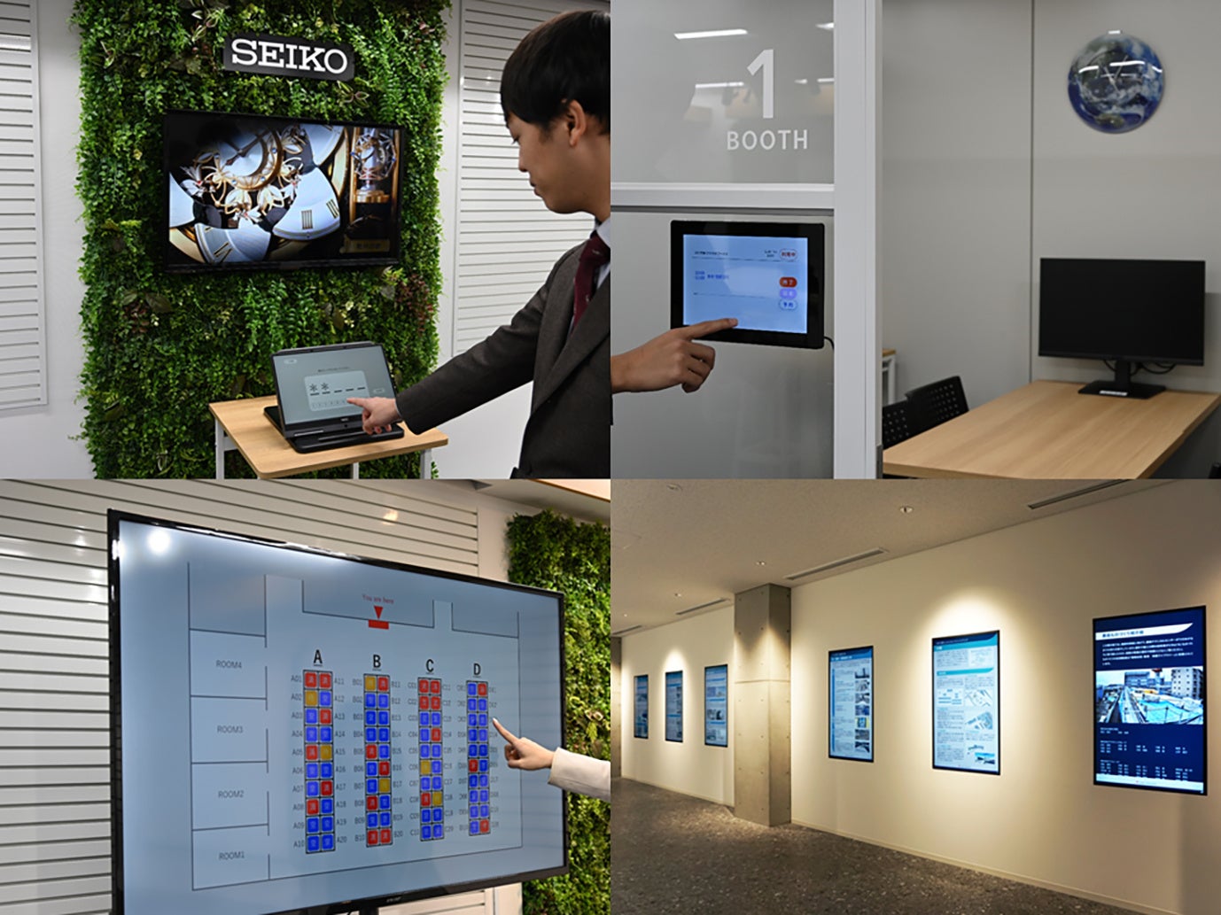 当社ブースでは、官公庁・企業・学校・病院・商業施設などで豊富な実績を有する「デジタルサイネージ」を中心に、会議室予約やクロックなどセイコーの現在~未来に向けた取り組みで皆様の課題解決に役立つソリューションをご提案いたします。