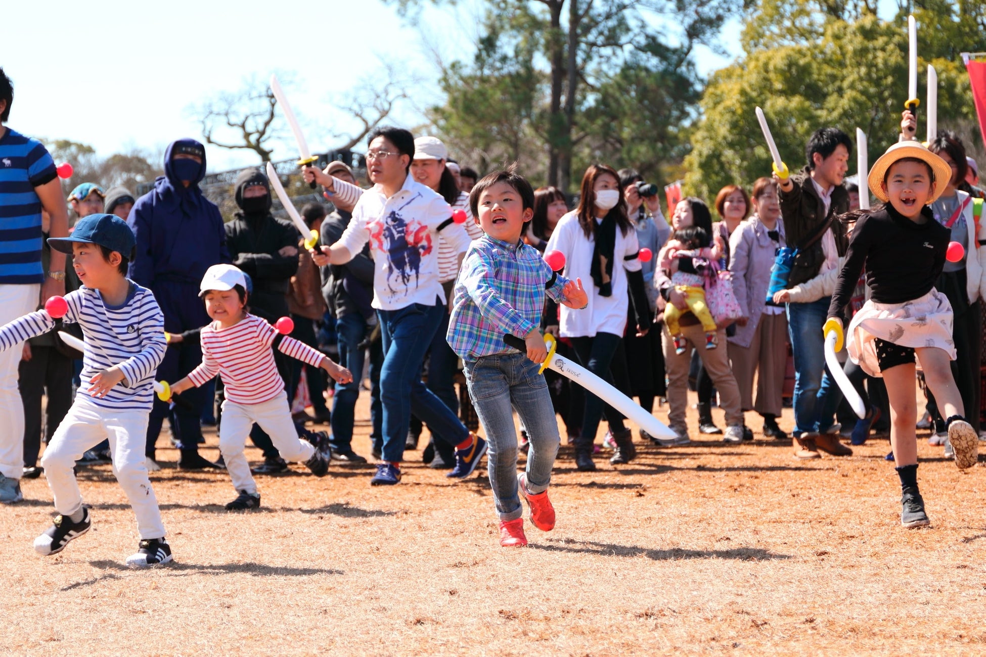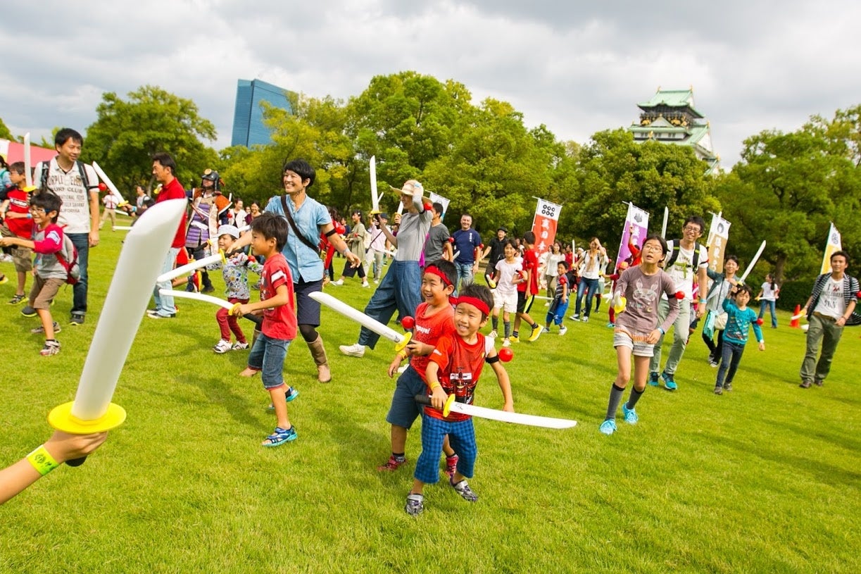 チャンバラ合戦は、柔らかいスポンジ刀で敵の腕についているボールを狙い落とすゲームです。50対50の軍に分かれて全滅戦や大将戦のルールで行います。今回は5歳以上の老若男女200名の募集で事前予約を受け付けています。