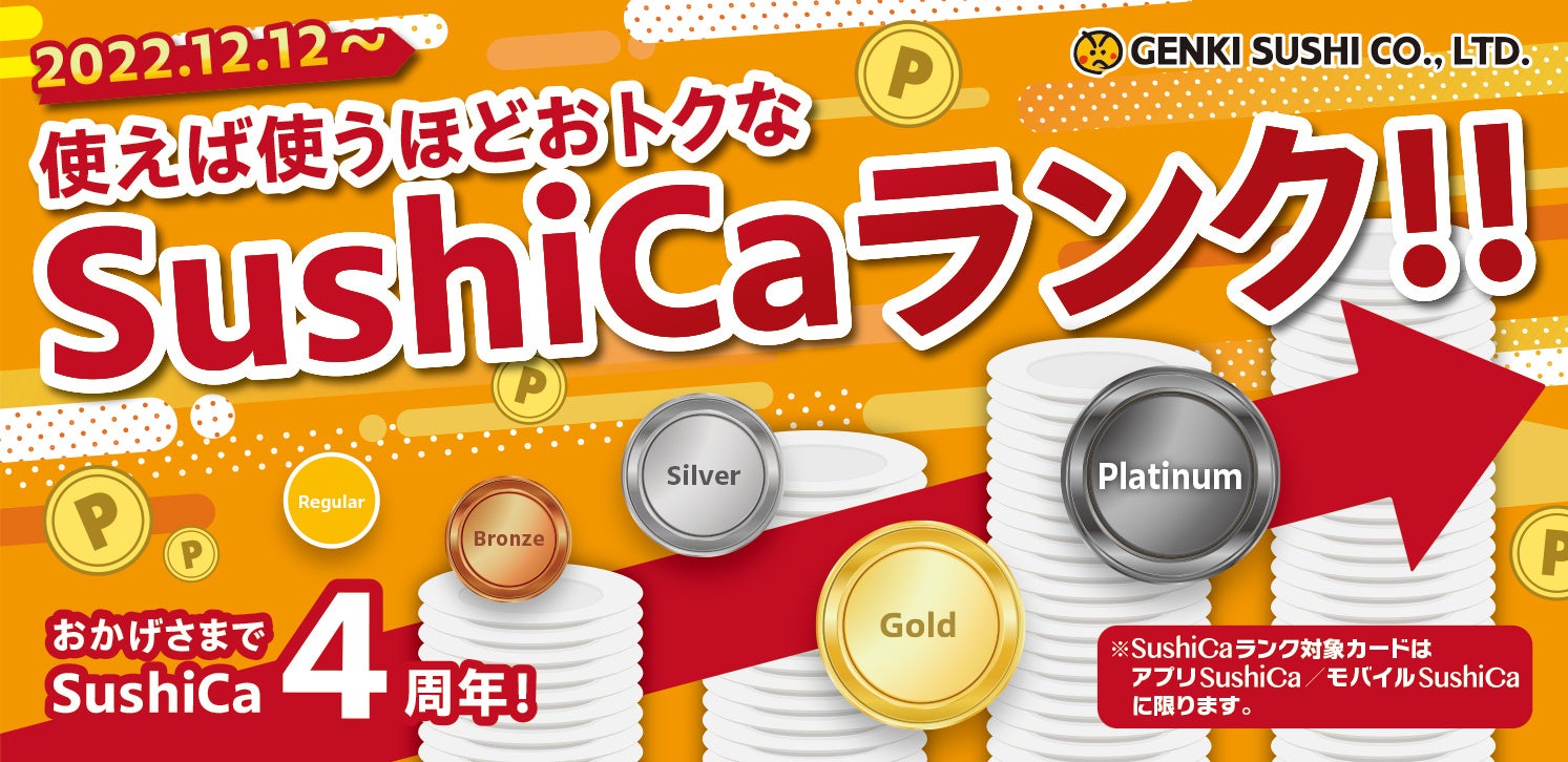 「SushiCa」は、元気寿司・魚べい・千両の各店で使えるおトクで便利なプリペイド&ポイントカードです。キャッシュレス決済が年々拡大している昨今、多くのお客様にご利用いただき、「SushiCa」は2022年12月12日(月)で4周年を迎えます。これを記念して、ご利用回数・ご利用金額に応じておトクにポイントが貯まる、『SushiCaランク』を導入いたします。