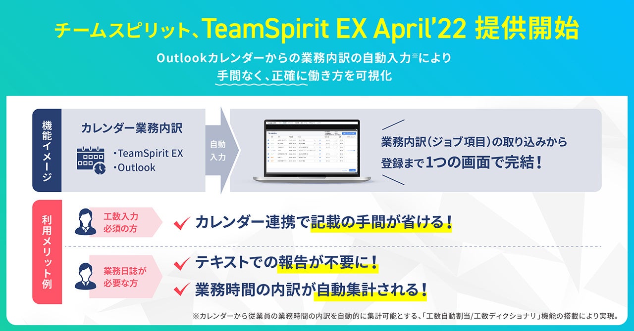 チームスピリット、「TeamSpirit EX April’22」の提供を開始 -Outlookカレンダーからの業務内訳の自動入力により”手間なく、正確に”働き方を可視化 -
