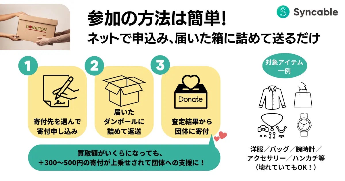 Brand PledgeはNPO・NGO等の団体へのブランド品寄付サービス。ブランド品買取サービス「ブランディア」と寄付プラットフォーム「Syncable」との共同サービスです。