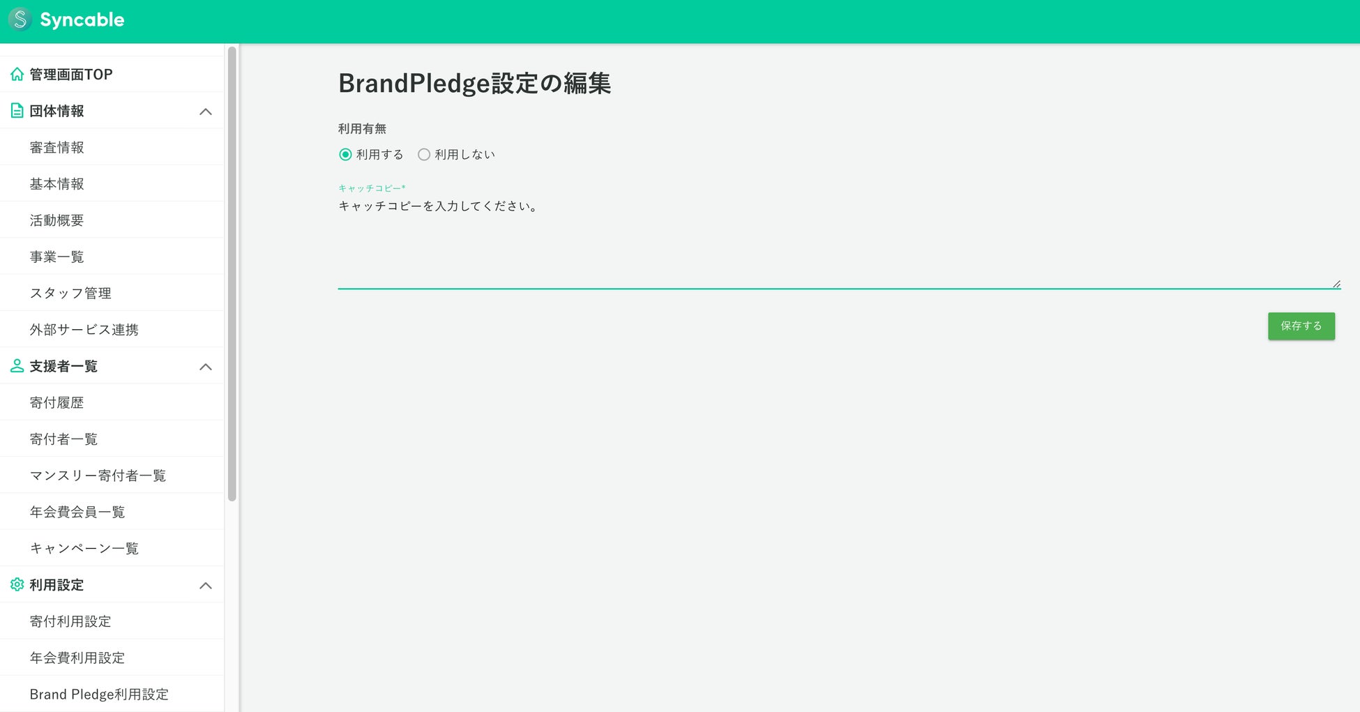 Syncable登録後、管理画面上「利用設定」内「Brand Pledge利用設定」画面より、「編集する」をクリック・「Brand Pledge設定の編集」画面より「利用する」を選択し、キャッチコピーをご入力の上「保存する」をクリックしてください。Brand Pledgeサイトに団体ページが作成され、ご利用いただけるようになります。