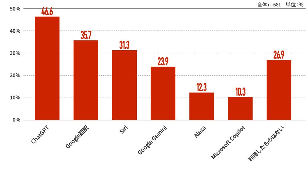 全体ではChatGPT(46%)が最も多く、認知している人のうち約半数が実際に利用。次にGoogle翻訳(36%)、Siri(31%)、Google Gemini(24%)と続きます。一方で、利用経験がない人も27%おり、認知はしていても活用には至っていない層も見られます。