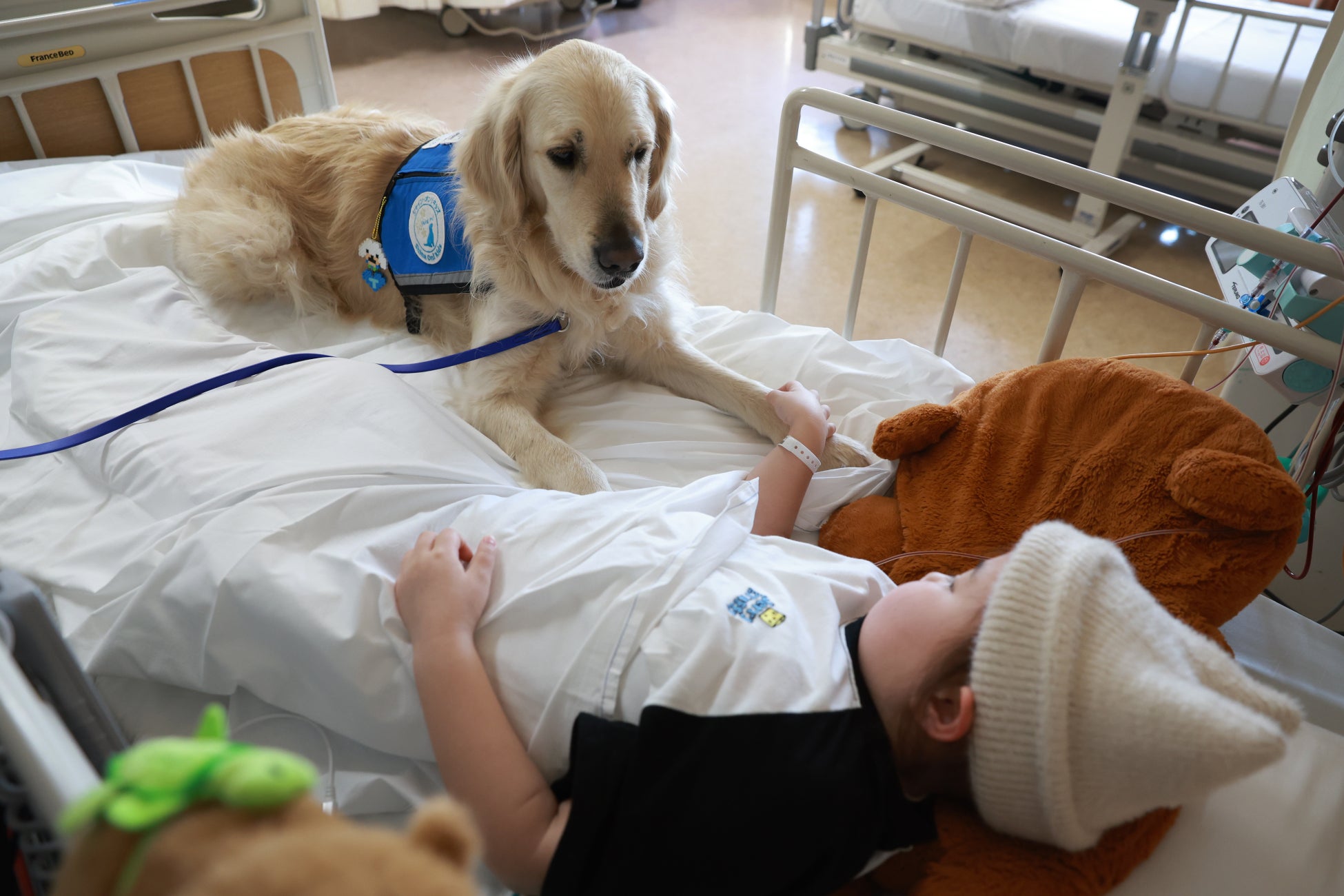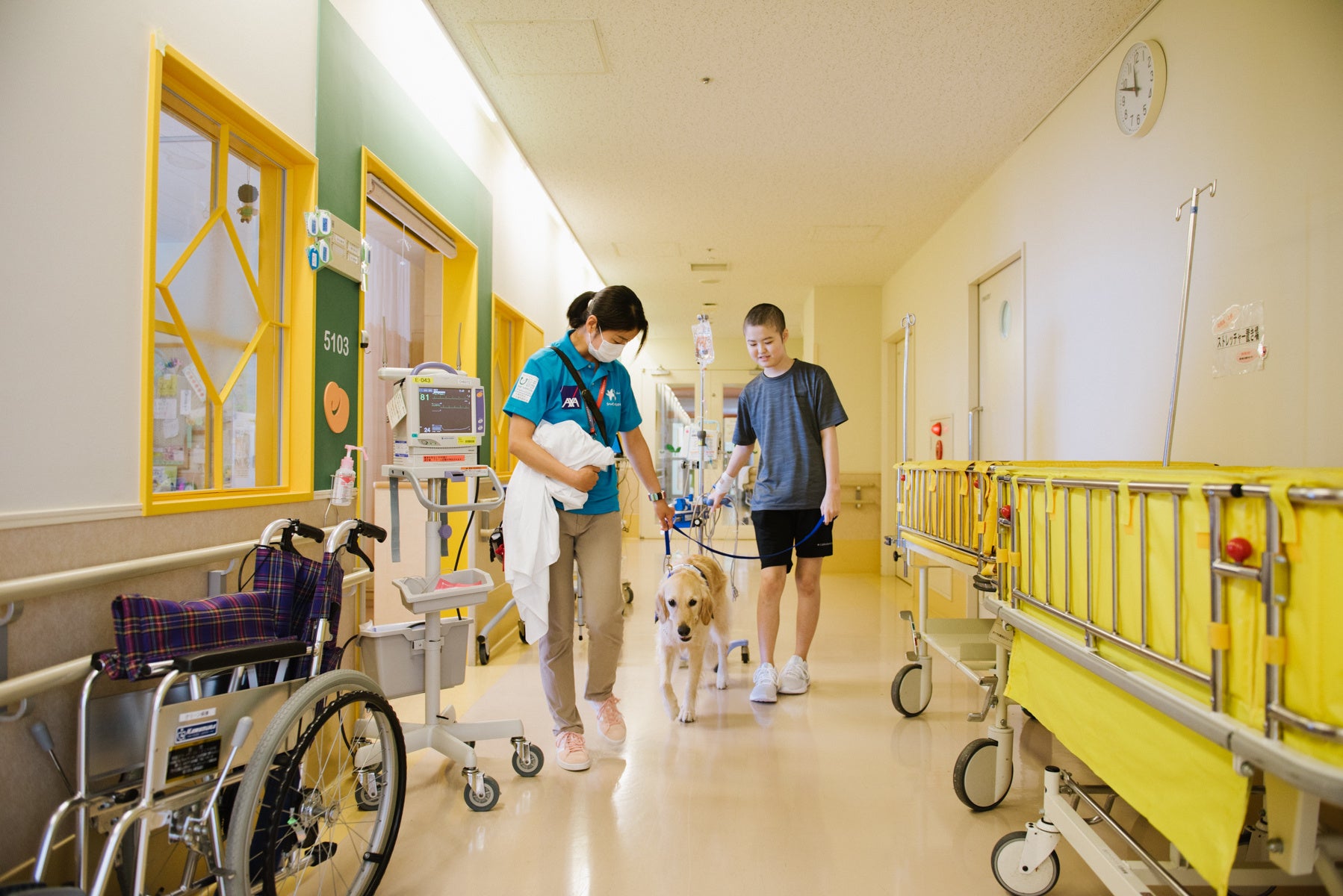 日本では静岡県立こども病院、神奈川県立こども医療センター、東京都立小児総合医療センター、国立成育医療研究センターの4病院で展開しています。大きな特徴は、毎日同じ病院に勤務し、個々のニーズに合わせた活動を行うことです。痛い検査や手術室への付き添い、リハビリ支援なども行います。いろいろな病院や施設を巡回訪問することはありません。ときどき訪れて短い時間だけふれ合うのではなく、同じ犬がいつもそこにいて多くの時間を繰り返し過ごせることが、入院治療している子どもたちの心の励みになります。