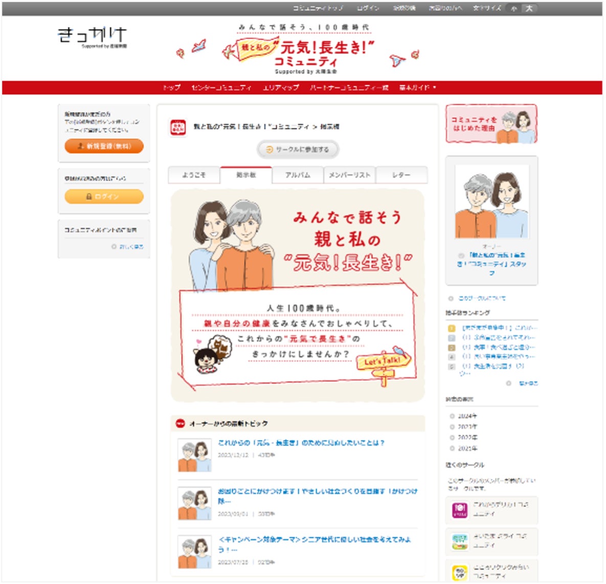 本コミュニティは、健康をテーマにさまざまな世代が語り合う場であると同時に、協賛社である太陽生命保険が「認知症保険」など社会的ニーズの高い商品・サービスを通じ日本の「元気!長生き!」を支えていることや、それにまつわるさまざまな取り組みへの理解促進を目的に運営しております。