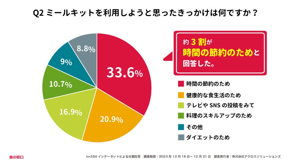 最も多い回答が「時間の節約のため」で33.6%、次点で「健康的な食生活のため」が20.9%でした。