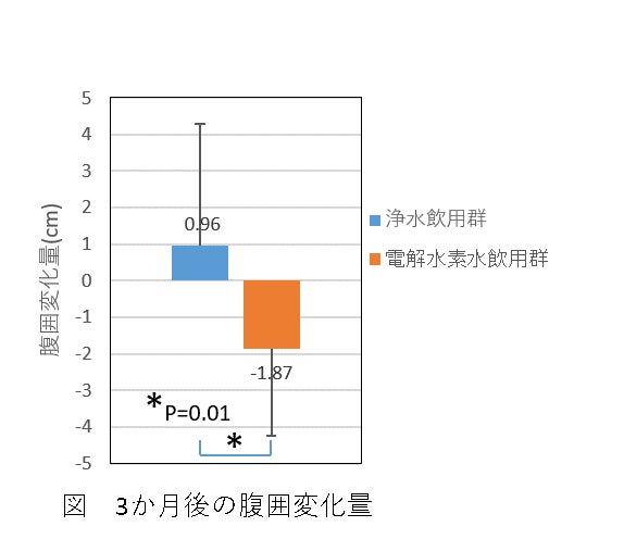 具体的には、電解水素水飲用群は飲用前に比べ腹囲が平均1.87cm減少、一方、浄水飲用群は平均0.96cm増加しました。