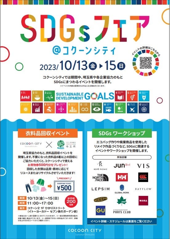 イベント期間中は、コクーンシティ館内にて埼玉県※と連携した「衣料品回収イベント」を実施するほか、コクーンシティの店舗による「SDGsワークショップ」を開催いたします!是非この機会にコクーンシティでSDGsに繋がる体験をしてみませんか。