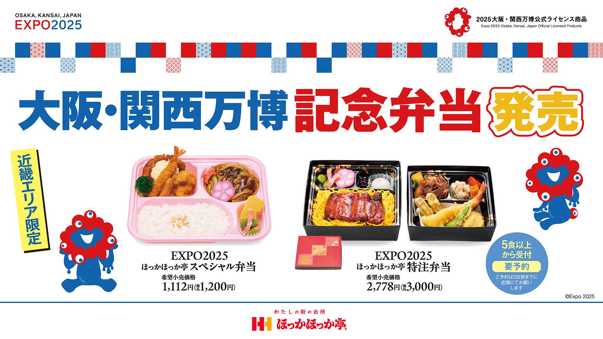 持ち帰り弁当事業のパイオニアである「株式会社ほっかほっか亭総本部(本社:大阪府大阪市、代表取締役会長兼社長:青木達也)は、2025年4月13日(日)より、2025年日本国際博覧会(略称:大阪・関西万博)・大阪ヘルスケアパビリオンへの出展を記念し、『EXPO2025 ほっかほっか亭 スペシャル弁当』、『EXPO2025 ほっかほっか亭 特注弁当』を近畿エリアの各店舗で発売いたします。