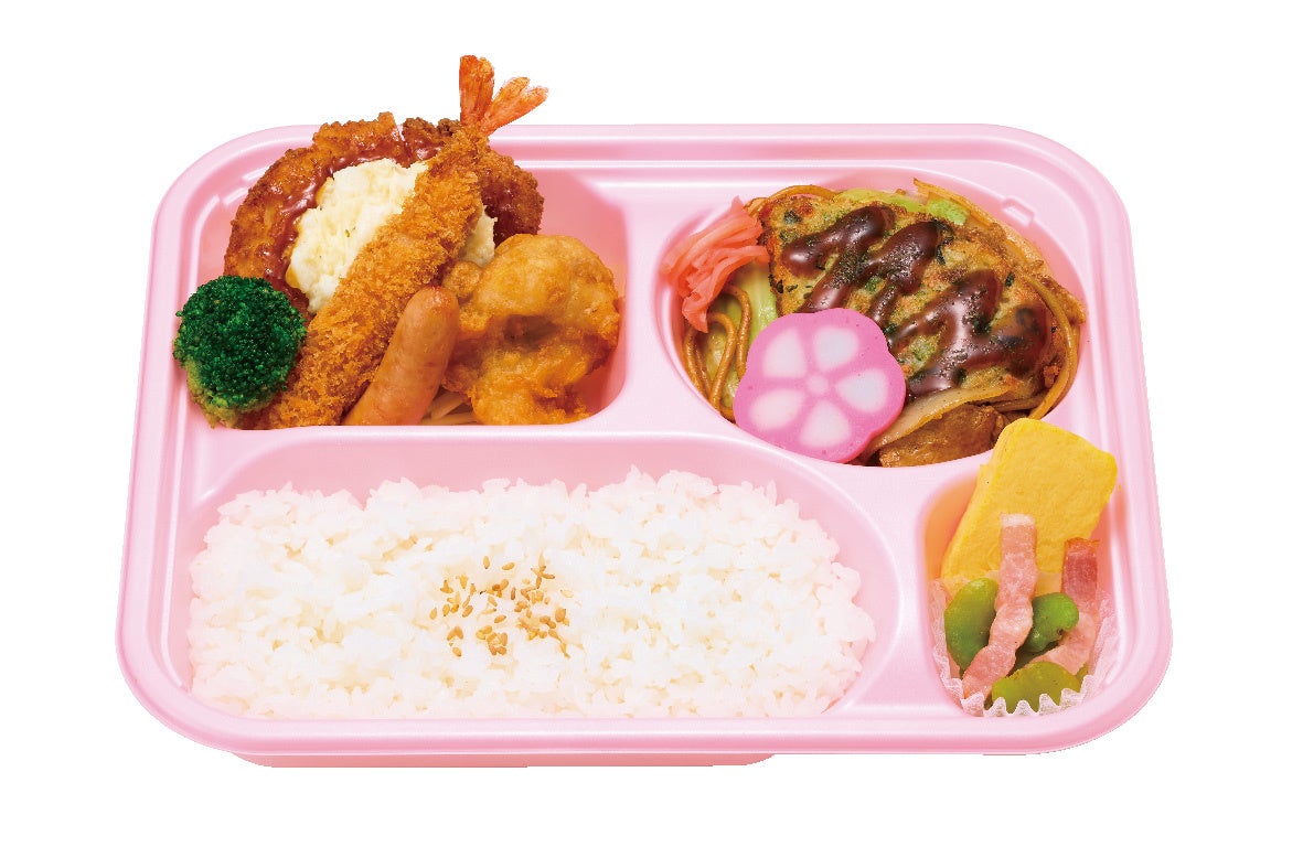 ほっかほっか亭のおかずで一番人気のオリジナル唐揚や、タルタルソースと黒酢あんの抜群のコンビネーションがたまらないチキン南蛮に、サクサク衣がたまらないえびフライ。大阪らしさを感じる粉もんメニューのお好み焼や焼きそばも入った、まさにスペシャルな弁当です。万博をイメージしたピンク色の容器に、花柄のかまぼこが彩りとなる視覚的にも楽しめるお弁当に仕上げました。