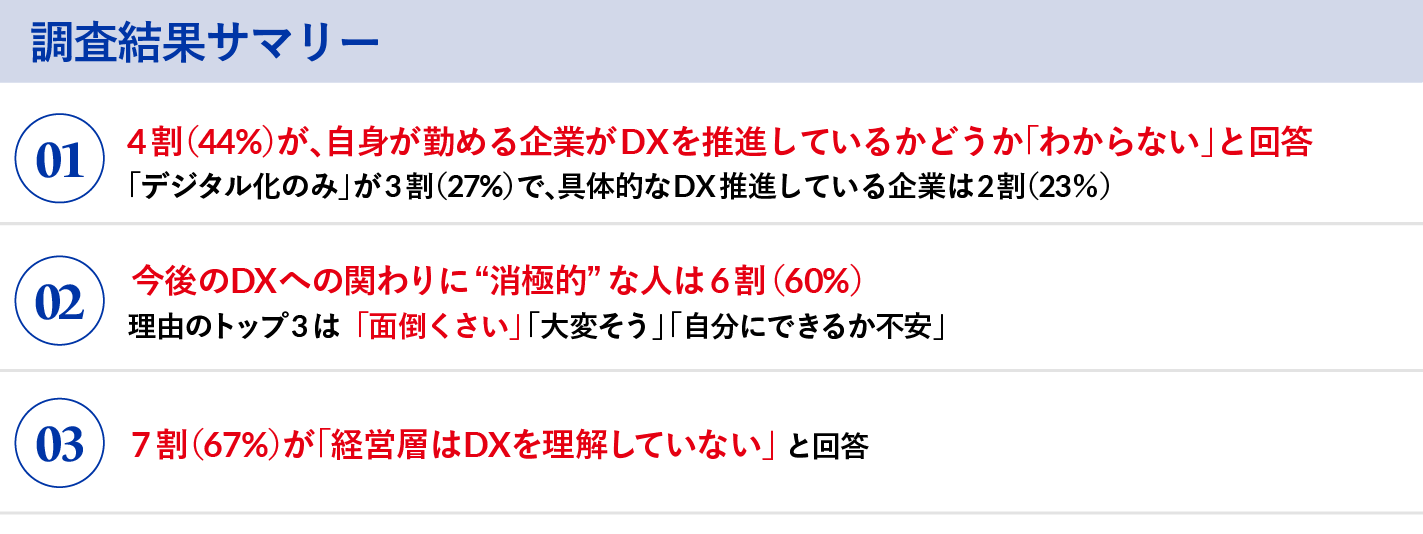 【大企業の従業員1,000名に聞いた「DXへの認識」に関する調査】会社がDXを推進しているか「わからない」が4割以上、DXへの関わりに“消極的”は約6割、理由1位は「面倒くさい」