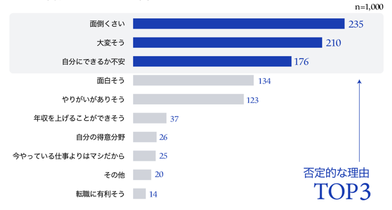 また、今後、会社が進めるDXに関わりたいかを聞いたところ、「ぜひ関わりたい」または「少し興味はある」と、関与に前向きな回答は半数以下(40%)にとどまり、「絶対に関わりたくない」「できれば関わりたくない」「言われたら仕方がない」といったDXへ関わることに“消極的”な回答は6割(60%)にのぼりました(グラフ2)。 その理由については、「面倒くさい」(235名)、「大変そう」(210名)、「自分にできるか不安」(180名)等のネガティブな回答を挙げた人が多くみられました(グラフ3)。