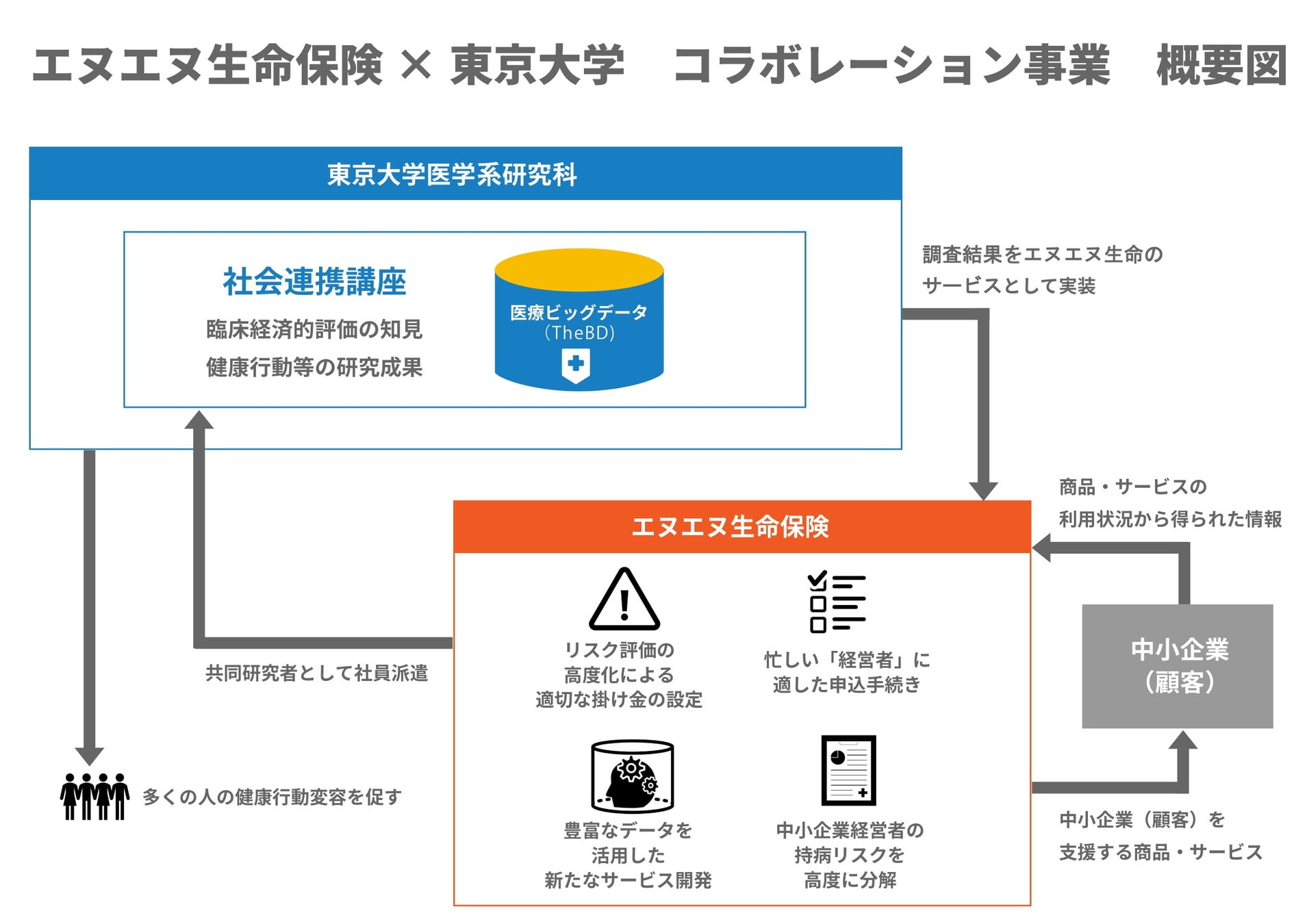エヌエヌ生命はこの度の契約締結に先立ち社内にデータアナリティクスチームを編成し、東京大学の医療ビッグデータやAI、機械学習を活用した共同研究を通じ、より精度の高い分析に基づく中小企業経営者向け商品・サービスの開発を強化していきます。