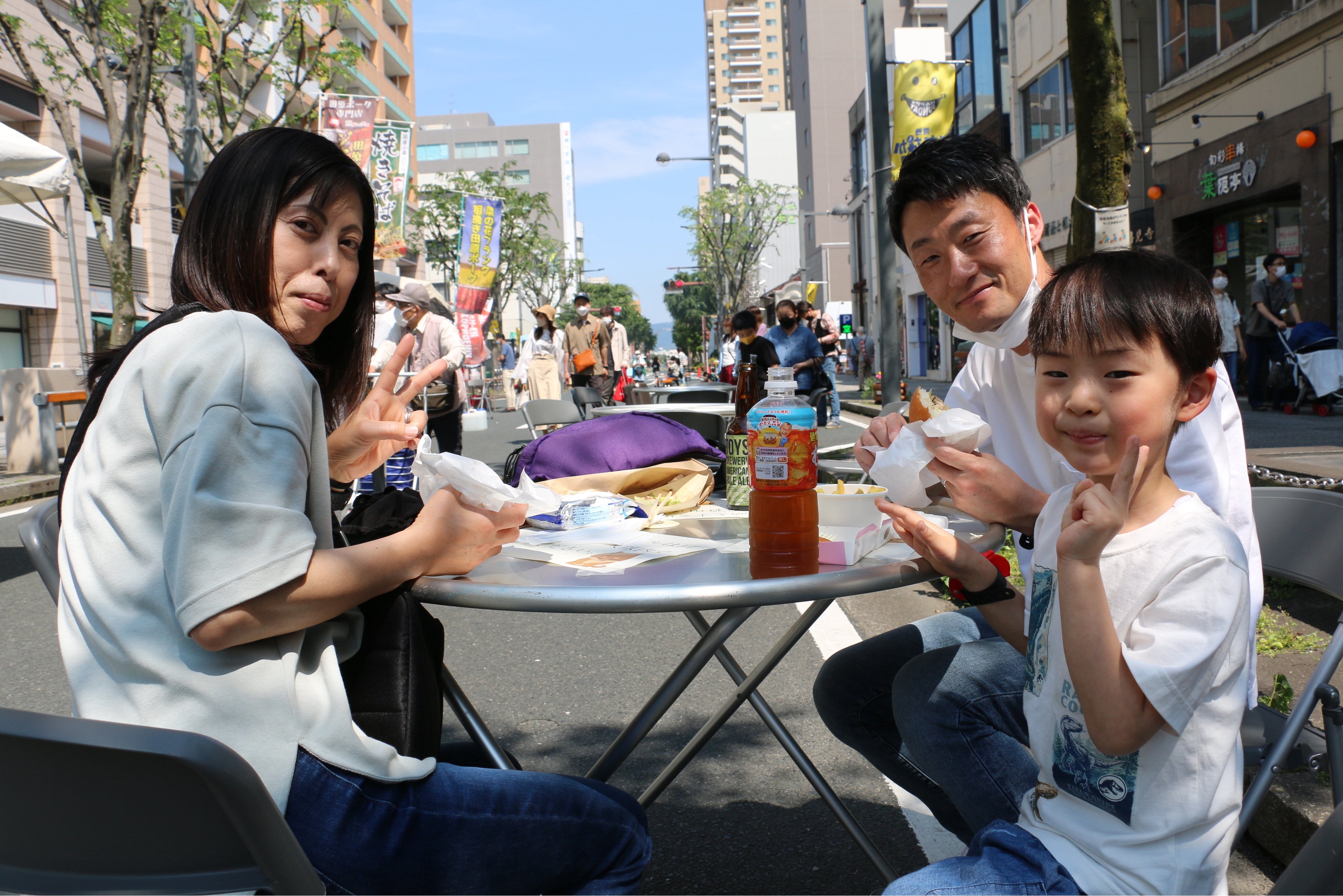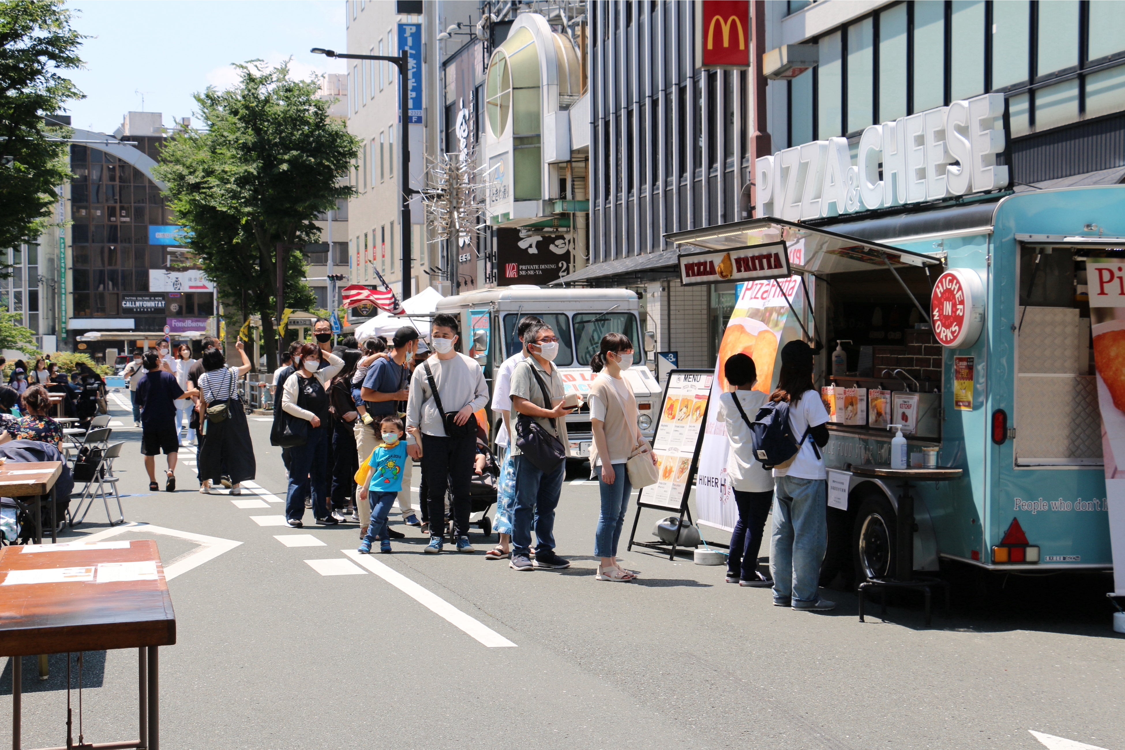 平成24年度から始まったホコ天。開始から数年間はおよそ年に10回程度開催していましたが、近年はコロナ禍の影響で中止や延期、頻度を下げざるを得ない状況が続いていました。今回のホコ天は「1・2Coinホコ天~Spicy&Hotフェス~」をテーマに、キッチンカーなど22店舗が出店し、1コイン、2コインで楽しめる特別メニューも用意。延べ来場者数は約20,000人と、コロナ禍であっても活気と賑わいが、まちなかにあふれていました。