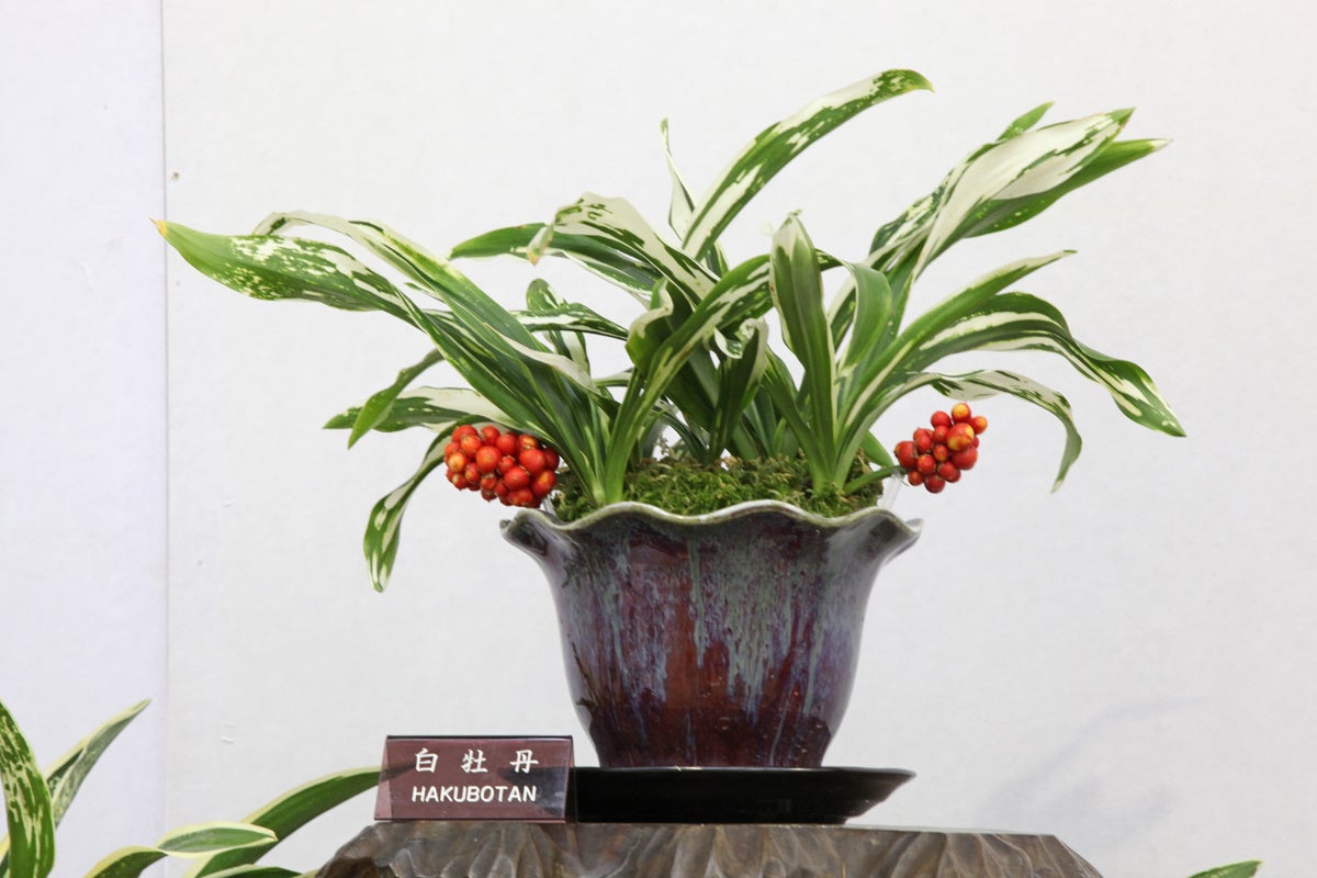 おもと展では「珍しい実」を付けた「おもとを50鉢展示」いたします。「万年青」と書く生き生きとした葉と真っ赤な実のコントラストをお楽しみいただけます。