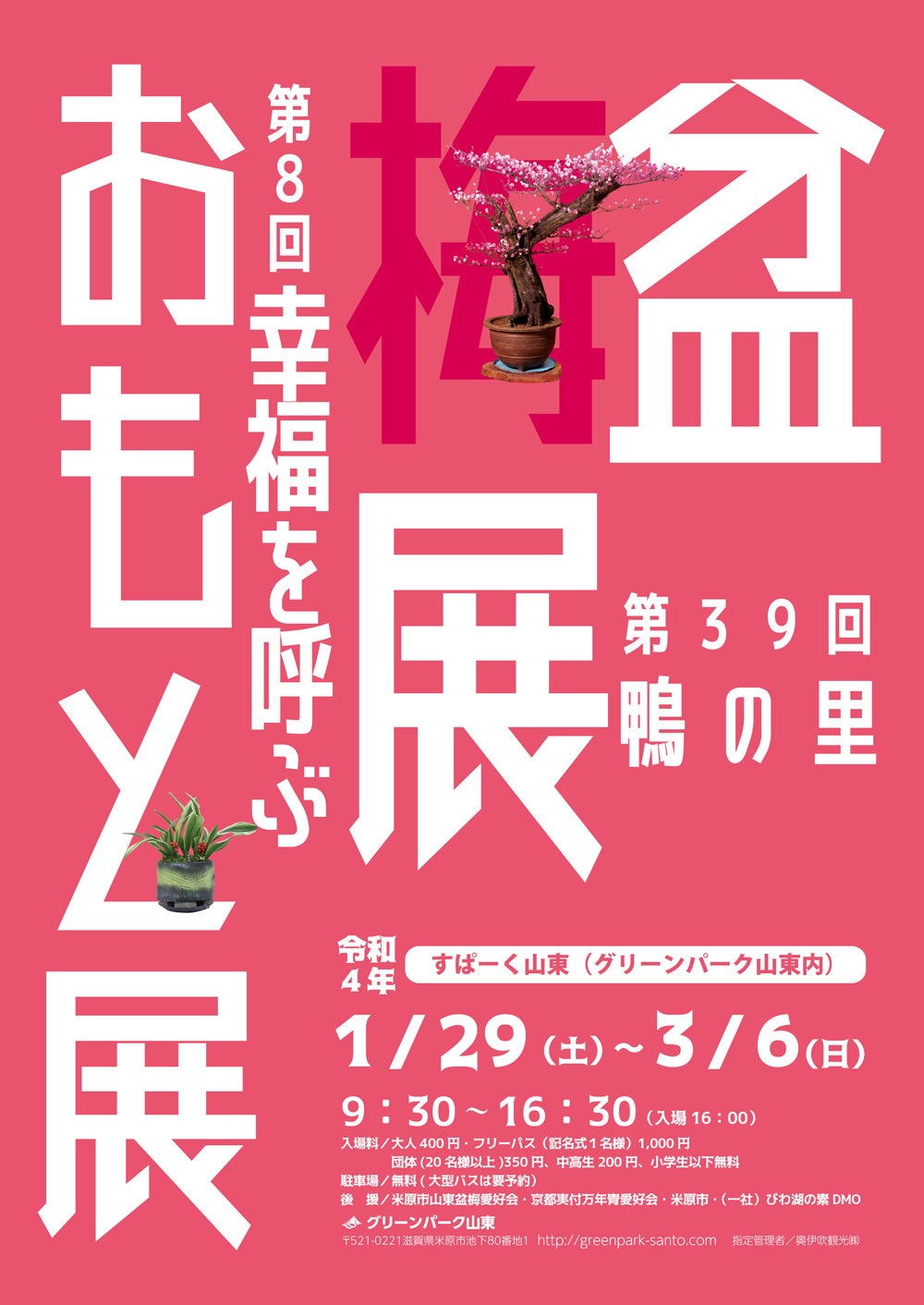 奥伊吹観光株式会社 が運営する滋賀県米原市にある「グリーンパーク山東」(https://greenpark-santo.com/)では1月29日から3月6日まで、2年ぶりに「第39回鴨の里盆梅展」と「第8回幸福を呼ぶおもと展」を開催いたします。キャンプ場を中心としたアウトドア複合レジャーとして運営するグリーンパーク山東の閑散期であるウィンターシーズンにも賑わいをと、グリーンパーク山東に会場を移し始めた盆梅展も今年で25回目を迎えます。盆梅展は地元愛好家25名が自宅で育てた「盆梅125鉢」を持ち寄り展示いたします。中には「推定樹齢300年の老木」もあり、「長浜盆梅展」とも異なり会員それぞれの個性が表現された作品が並びます。