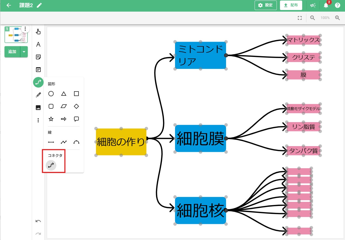 オブジェクト同士をコネクタで接続することで関係性が表現しやすくなり、コンセプトマップ(情報を整理するための視覚的な図)の作成などにも役立ちます。