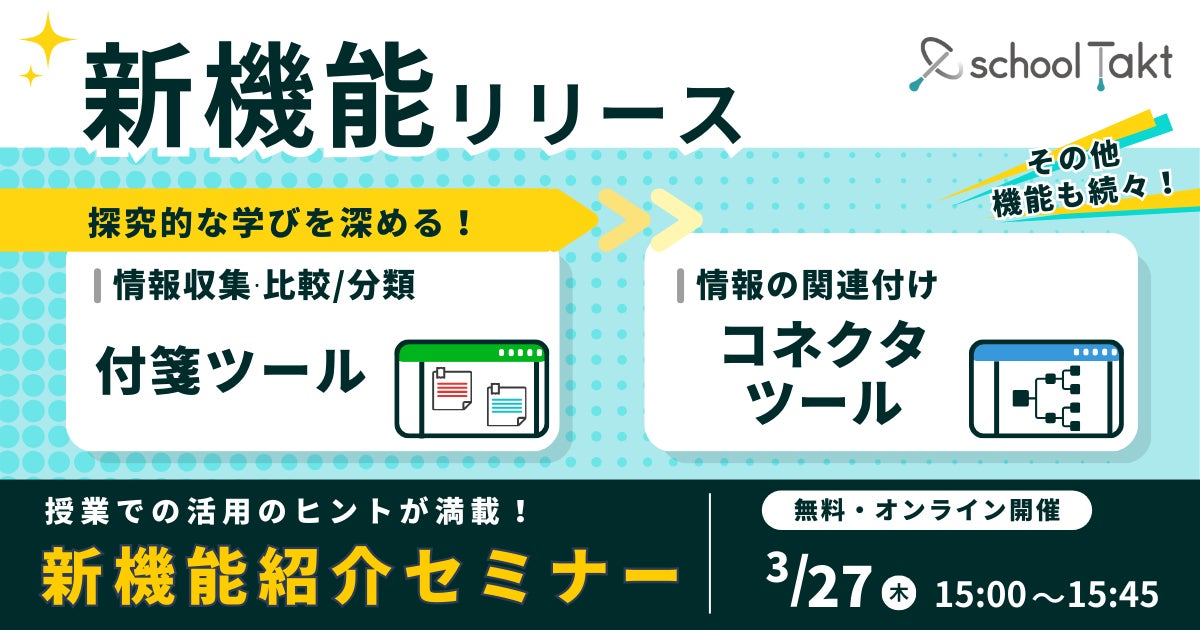 株式会社コードタクト(本社:東京都渋谷区、代表取締役:後藤 正樹、以下「当社」)は、2025年2月21日(金)にスクールタクトの新機能「付箋ツール」「コネクタツール」「回答編集モード」などを追加しました。探究的な学びを促進し、授業運営の利便性も向上します。