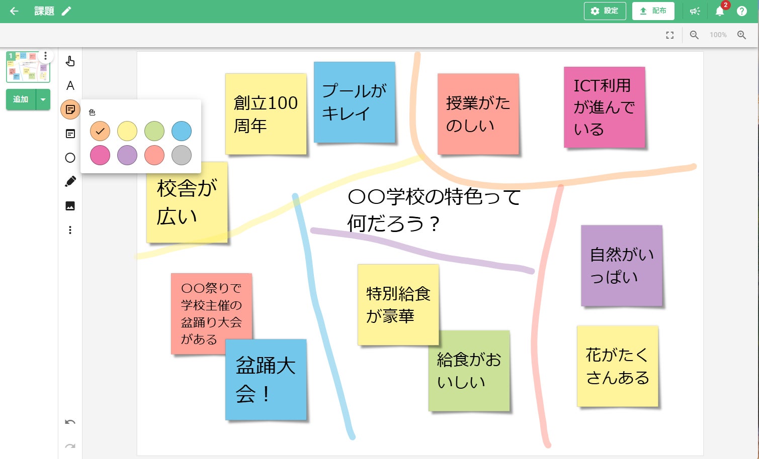 付箋は8色から選べ、移動・回転などの操作ができるムーブパーツに設定することで、先生が作成した付箋を児童生徒が動かすこともできます。
