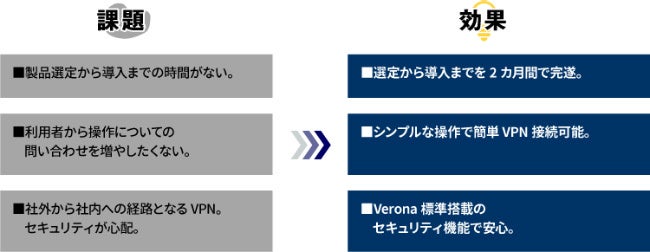 クラウドVPN「Verona」は、インターネット上に自社専用のプライベートラインを構築するクラウドVPNサービスです。昨今、テレワーク需要の高まりからVPN装置を狙ったサイバー攻撃が増加傾向にありますが、Veronaにはクライアント証明書認証やダイナミックポートコントロール機能など、高度なセキュリティ機能が標準搭載されていると共に、クラウドからの運用監視サービスが付帯しているため、セキュアなプライベートアクセス環境ネットワークを容易に構築・維持することが可能です。