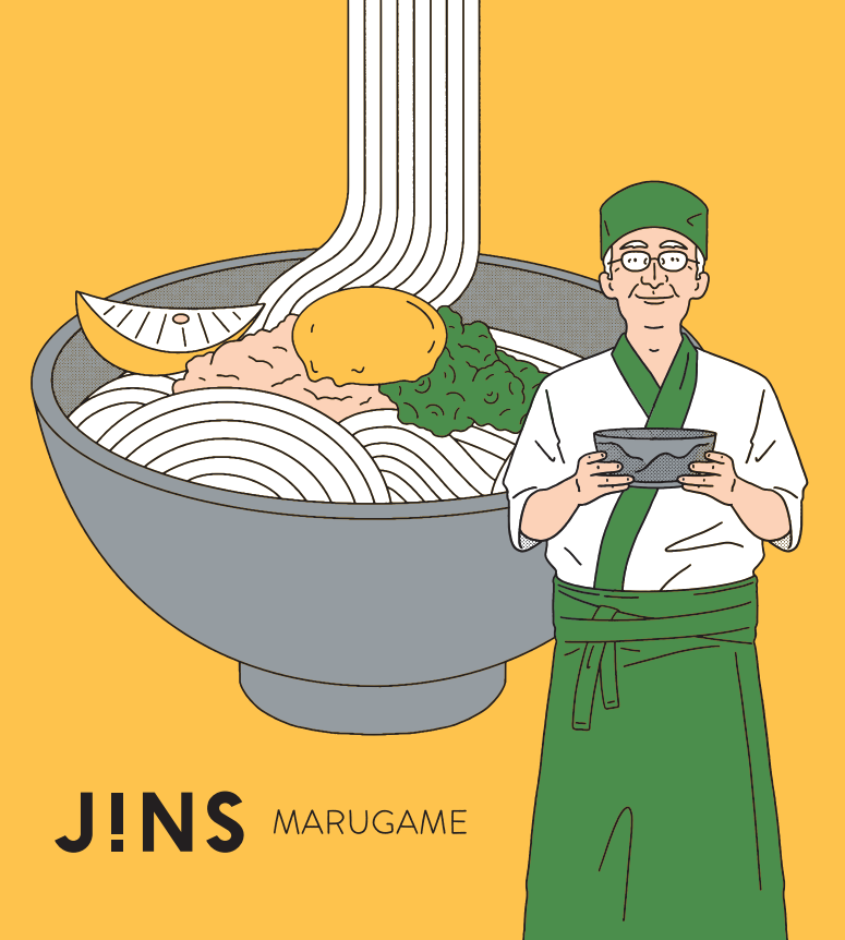 イラストレーターYunosuke氏を起用。香川の名物であるうどんとメガネをかけたうどん職人をイメージしたグラフィックが店内を彩ります。