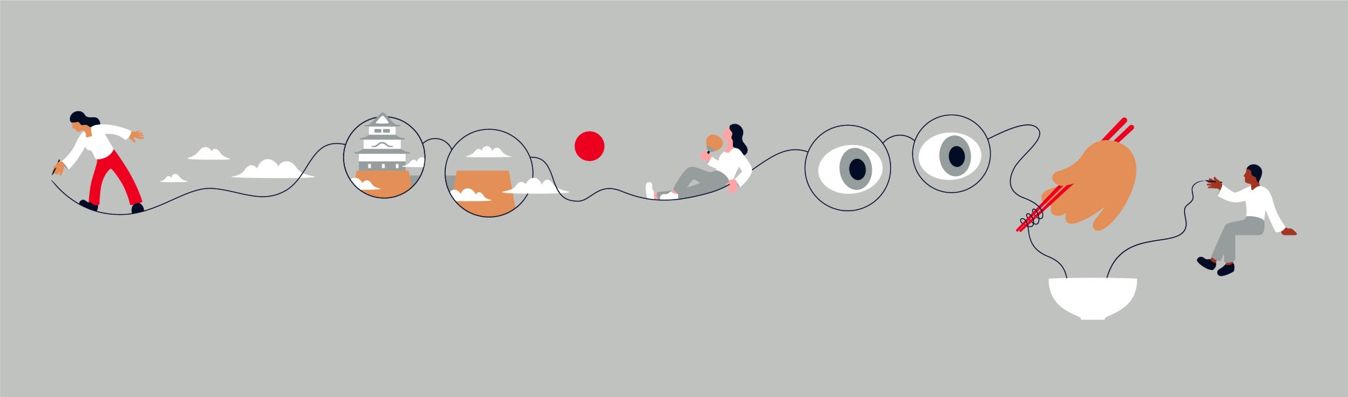 JINS丸亀店の壁面デザインは、創造性、想像力、そしてブランドとしてのJINSを称えるとともに、店舗の場所を映したものです。キャラクターが描く線は、丸亀城、うちわ、うどんなどをモチーフに、店内へ広がっていくように描いており、創造性と想像力を象徴するこの線は、キャラクターとメガネを、地域の要素を、そして最終的にはそれら全て、互いに結びつけています。