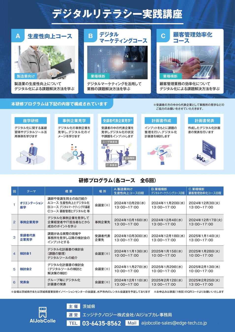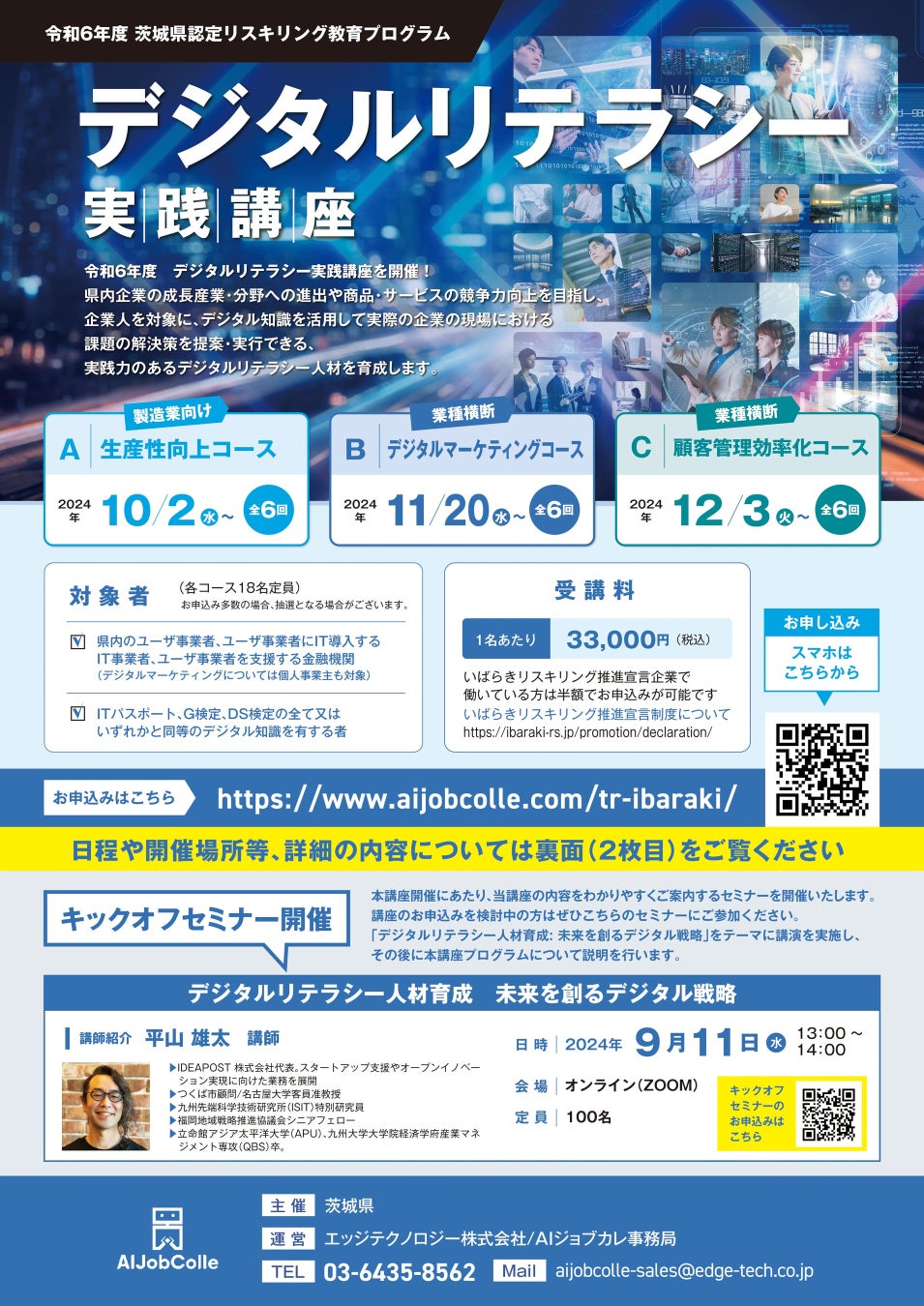 エッジテクノロジー株式会社は茨城県の委託を受け、茨城県認定リスキリング教育プログラム「デジタルリテラシー実践講座」を開催します。