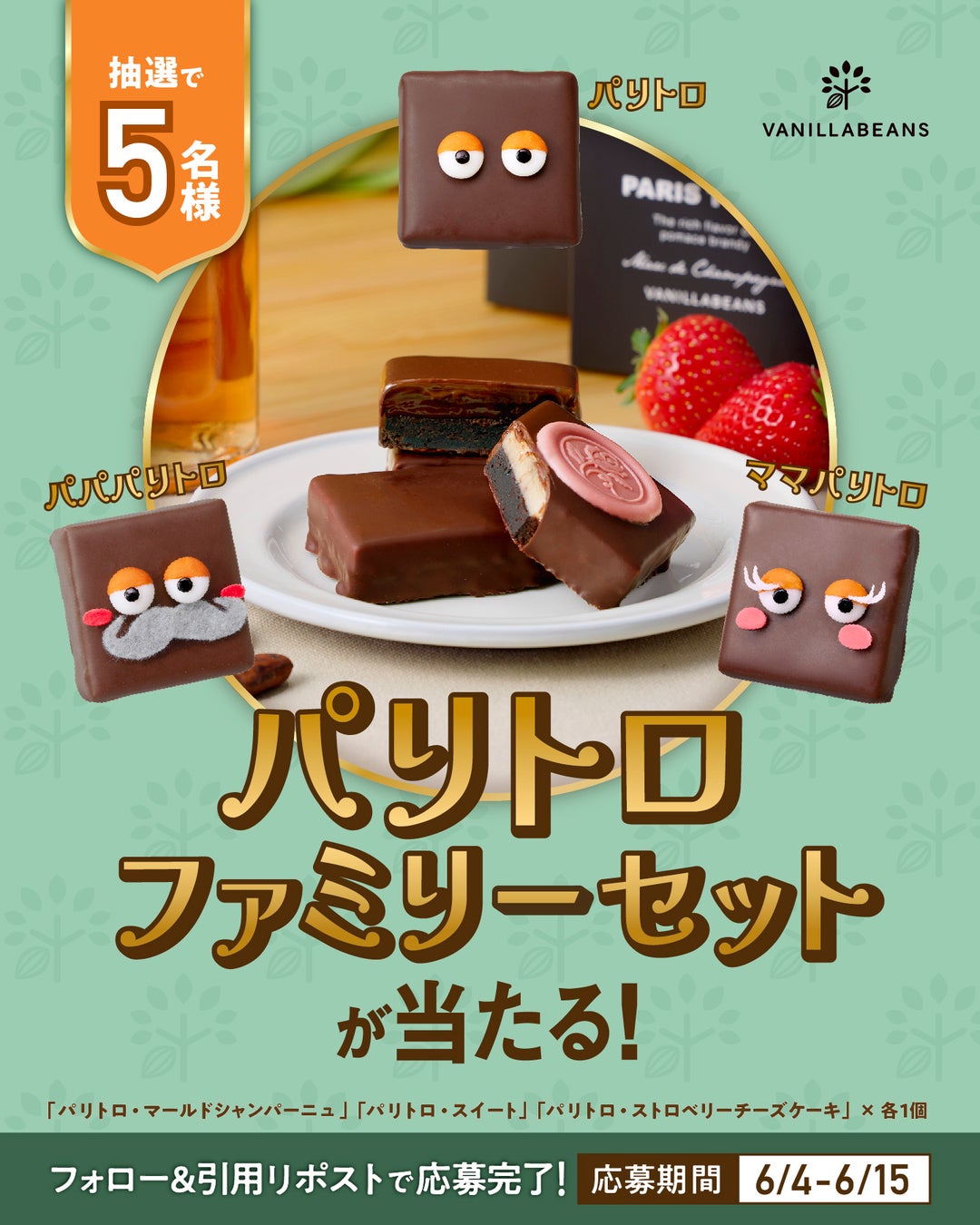 SNSプレゼントキャンペーンまもなく終了!VANILLABEANSオンラインショップ限定、専門店の濃厚プチショコラケーキ3種豪華食べ比べ「パリトロファミリーセット」6月15日(日)12:00販売開始!