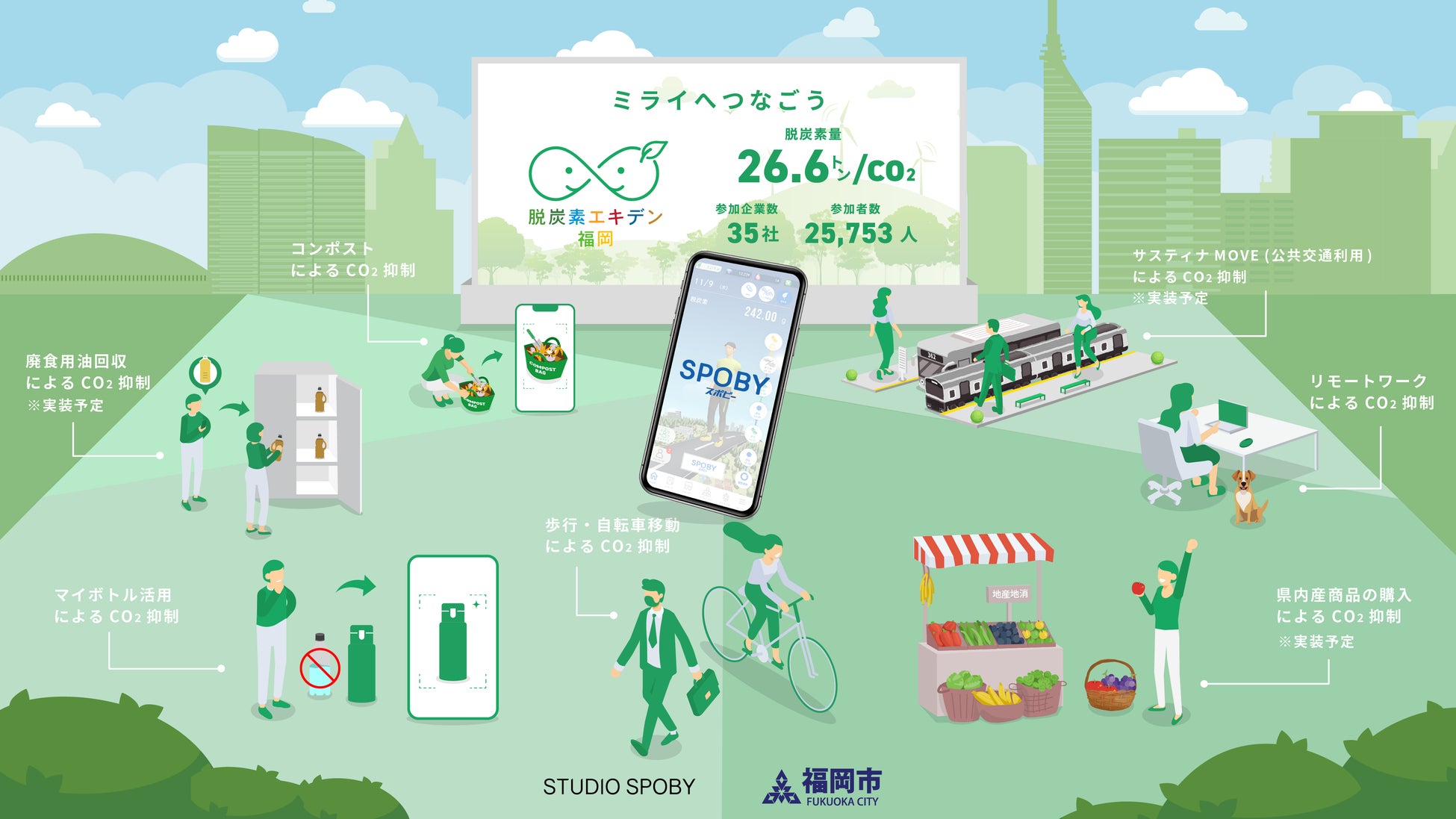 脱炭素社会の実現に向けて、株式会社スタジオスポビー(東京都中央区、代表取締役:夏目恭行、以下「当社」)は、福岡市が掲げる「2040年度温室効果ガス排出量実質ゼロ」の実現に向けた取り組みとして、2025年3月より、福岡市民及び企業従業員一人ひとりの脱炭素型ライフスタイルへの移行を促進する「脱炭素エキデン福岡」を開始します。AI技術を搭載させた脱炭素アプリ「SPOBY」で、行政と企業が一丸となり個人脱炭素を推進します。