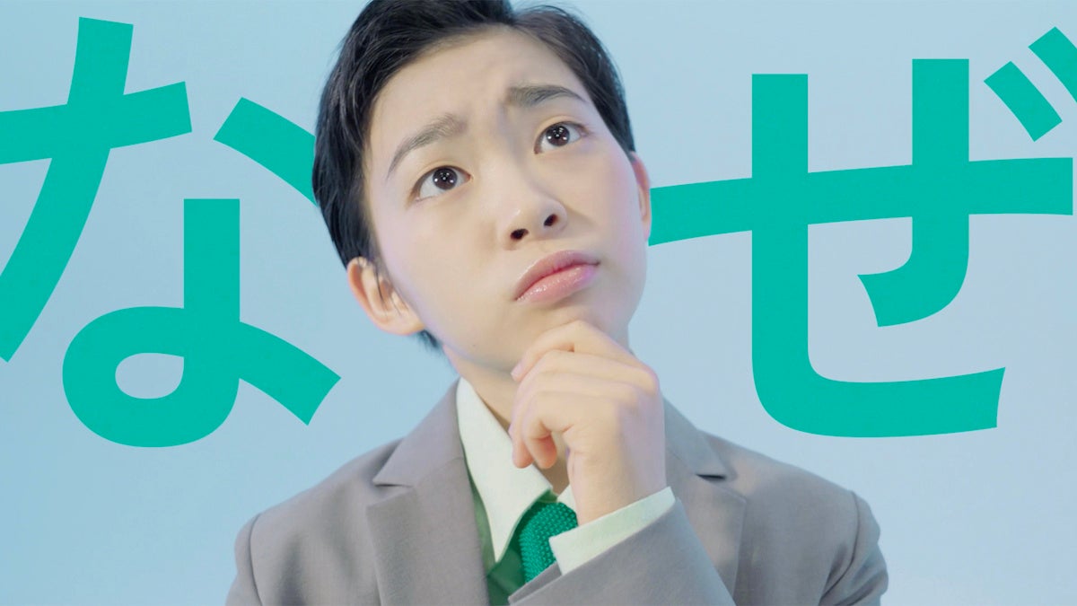 「なぜ?」と首を傾げながら、とある会社の採用の秘密について考える村山輝星さん。ここでの役どころは、日本企業の人手不足と採用の工夫をクローズアップするキャスターです。低コストの採用で人手不足にならない会社の秘密は、50歳以上の即戦力が採用できる求人サイト「シニアジョブ」にありました。華麗なジャンプと着地を決める輝星さん。実は輝星さんが歩いていたのは「シニアジョブ」のロゴの上だったのです。「グッジョブ!シニアジョブ!」の決め台詞にも注目。