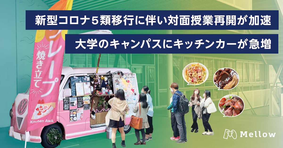 日本最大級のモビリティビジネス・プラットフォーム「SHOP STOP」を展開する株式会社Mellow(本社:東京都千代田区 代表:石澤正芳、以下「メロウ」)は、新型コロナ5類移行での対面授業再開に伴い、4月に大学などの教育機関で新規で導入されたキッチンカー数が日本体育大学をはじめ34キャンパスとなり、過去最多の営業場所がオープンしました。今年の4月は新型コロナウイルス感染症の状況が改善し、多くの大学が対面授業を再開、密を回避しつつ食事を学生に提供したい学校側と、大学に通学する学生たちの食の需要が高まり大学の空きスペースでのキッチンカー導入が加速しましたことをお知らせいたします。