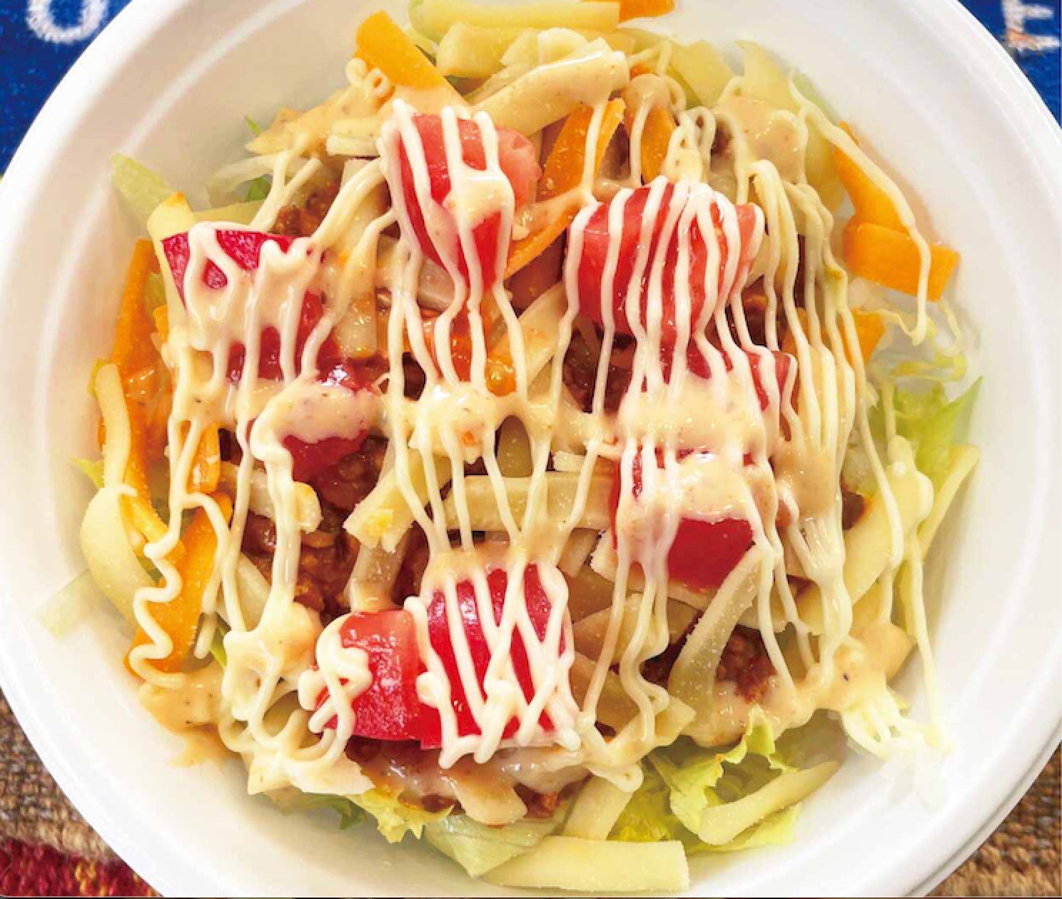 特徴は大盛りで、たった50円の追加料金で大盛りにできます。大盛りのタコライスは、男女を問わず、日本体育大学の学生に人気が高いそうで、店主は、「学生たちが大盛りを注文する姿」がとても嬉しいとのことでした。