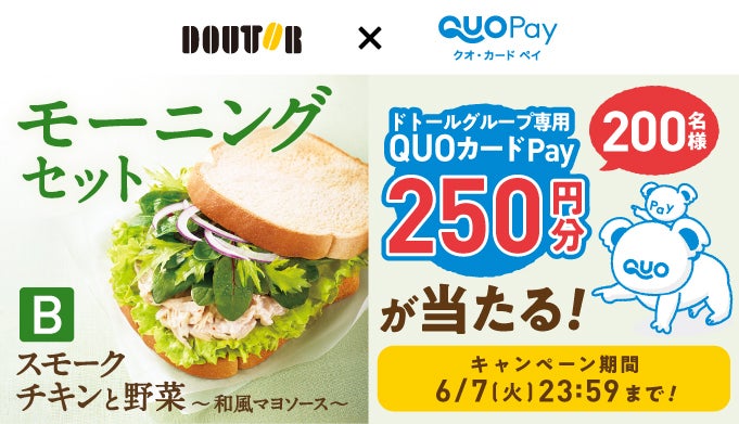 この機会にぜひ、本キャンペーンに参加し、QUOカードPayを入手し、ドトールコーヒーショップにて好評発売中の「モーニング・セットB スモークチキンと野菜~和風マヨソース~」をお楽しみください。