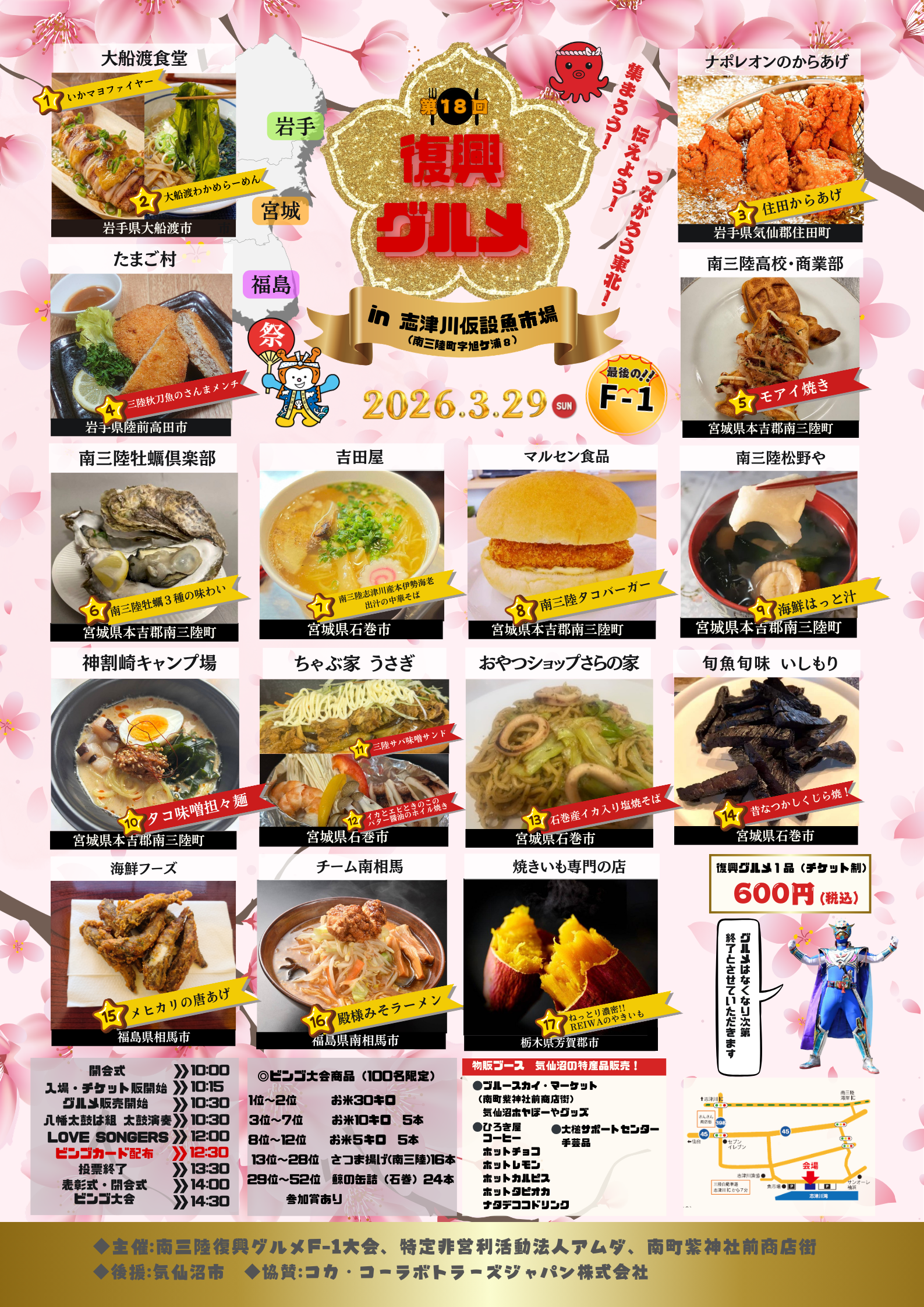 東日本大震災の被災地から生まれたフードイベント「第18回 復興グルメF-1大会 ~集まろう!伝えよう!つながろう東北!~」が、2026年3月29日(日)、宮城県南三陸町の志津川仮設魚市場で開催されます。本大会は、前回大会(2023年)から約3年ぶりの開催となり、今回が最後の大会となります。