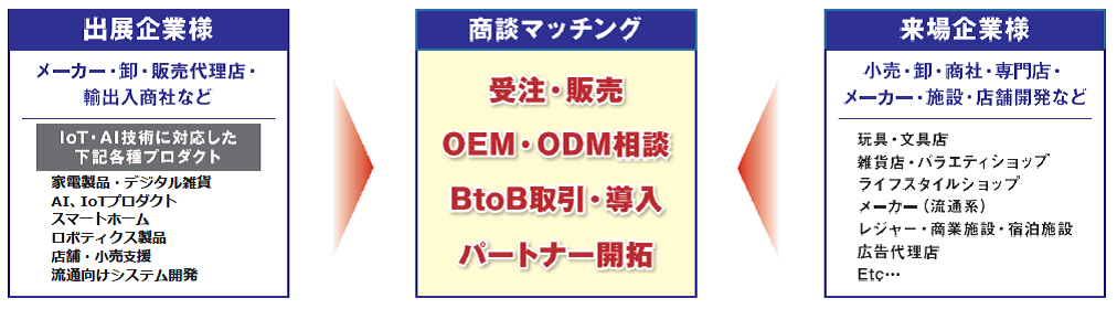 併催展である「東京インターナショナル・ギフト・ショー」及び「LIFE×DESIGN」は圧倒的な流通業界での知名度を誇ると共に、商業施設、店舗開発、住産業関連といった暮らしに関わるビジネスに関わる来場実績を多数有しております。これらの業界関係者と直接商談することが出来る展示会が「スマートテックEXPO」です。