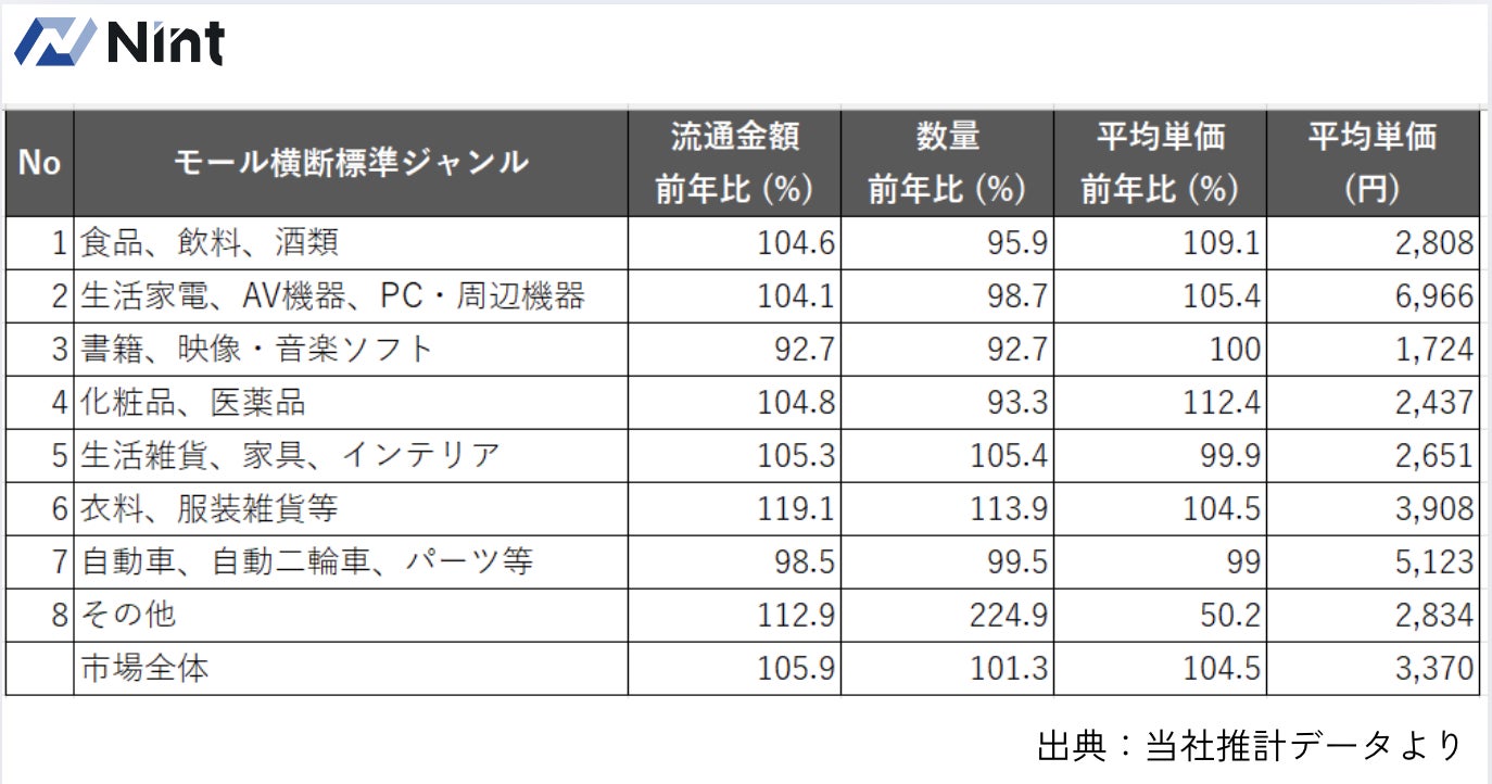 Nintの推計データによれば、3大ECモール全体の平均単価は前年比104.5%となっています。各ジャンルでの平均単価の上昇率は105.4%から112.3%に達し、この傾向を裏付けています。