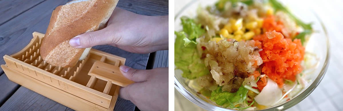大根おろし以外にも、玉ねぎをすりおろして自家製ドレッシングにしたり、パンやチーズを削っても美味しく仕上がります。竹の柔軟性と硬さを活かしたこの鬼おろしは、食材の味を引き出し、家庭料理に一味違う美味しさを提供します。