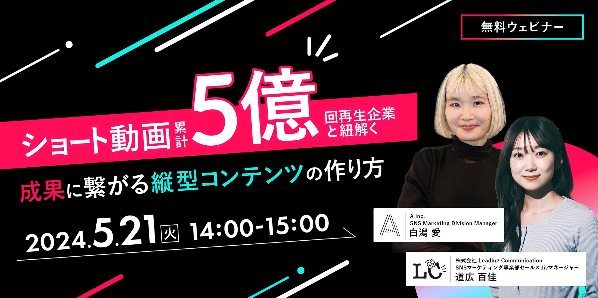 株式会社A(https://acetokyo.com/)は、株式会社Leading Communication(https://www.le-commu.co.jp/)と共催にて、「【ショート動画累計5億回再生企業と紐解く】 成果に繋がる縦型コンテンツの作り方」と題した無料ウェビナーを5月21日(火)にオンラインで開催します。