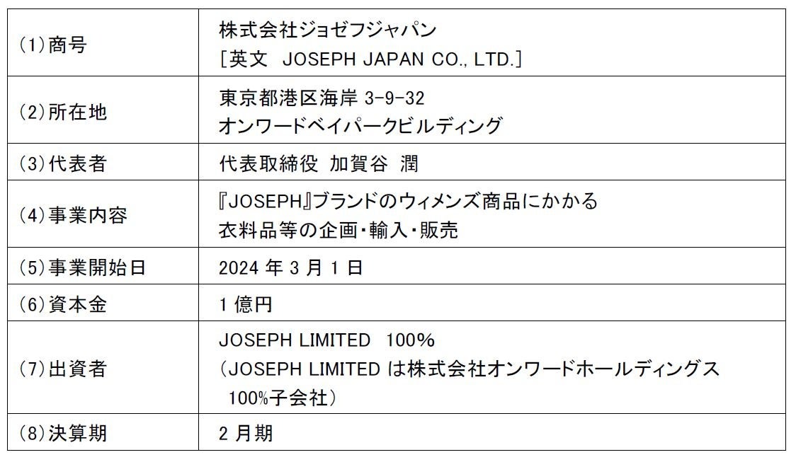 株式会社オンワードホールディングス(本社:東京都中央区 代表取締役社長:保元 道宣)は、当社グループのグローバル戦略を加速するため、当社の100%子会社である英国法人JOSEPH LIMITED社の100%子会社として「株式会社ジョゼフジャパン」を設立いたしましたのでお知らせいたします。