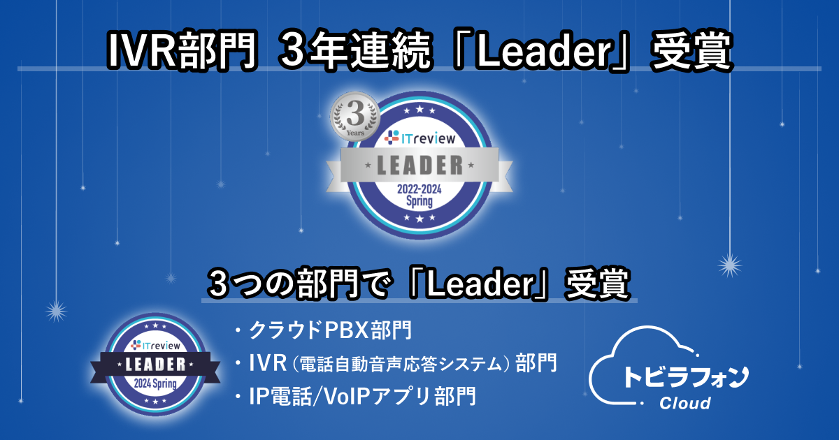 「トビラフォン Cloud」が、ITreview Grid Award 2024 SpringのクラウドPBX・IVR・IP電話/VoIPアプリの3部門で「Leader」を9期連続受賞