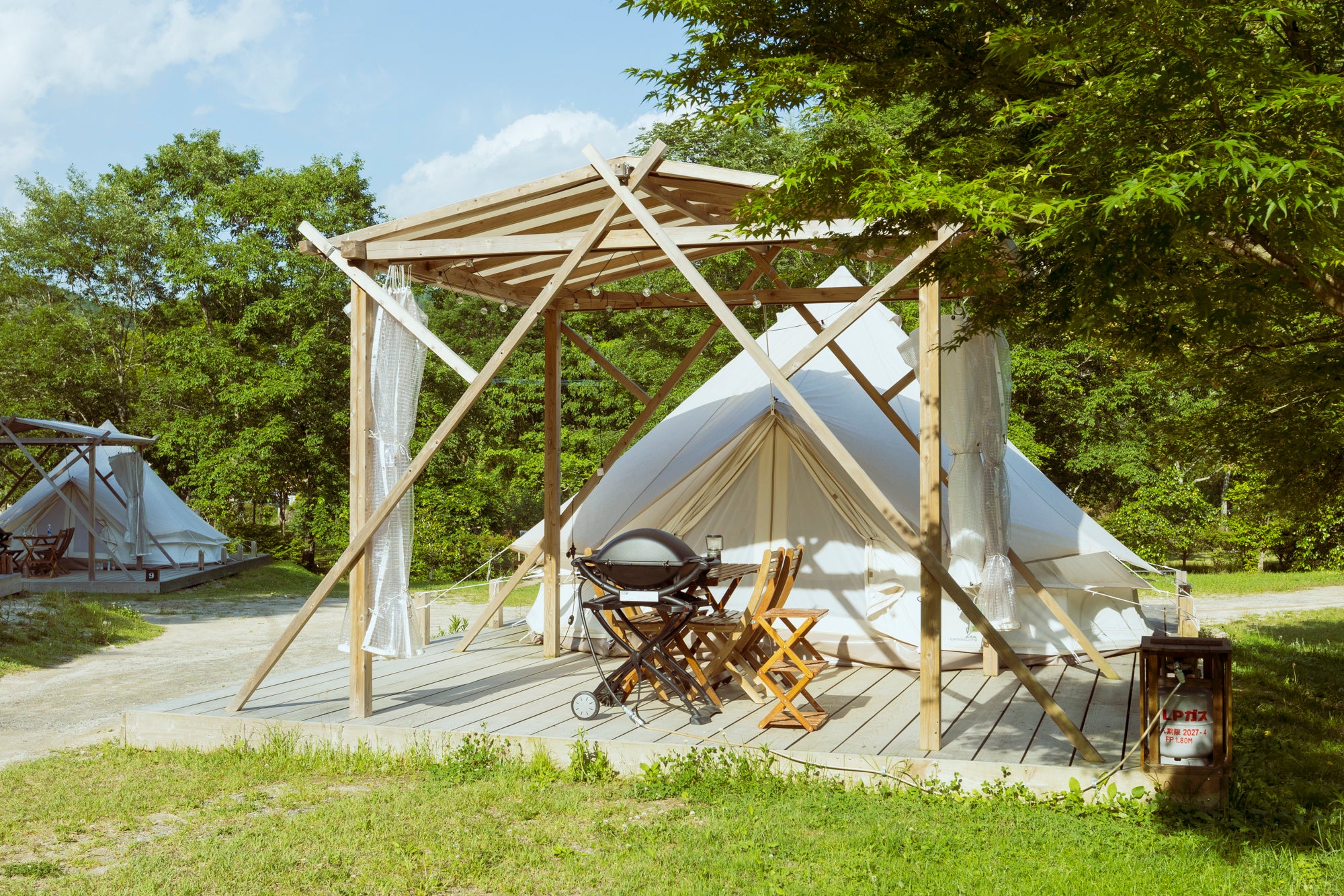 BBQはテント前の屋根のついたウッドデッキにて、BBQ本場アメリカweber社のガスグリルで夕食をお楽しみいただけます。着火や準備、片付けなどは全てスタッフで行いますので、はじめての方でも心配不要。調味料・お皿もすべて用意しているため、事前に食材や食器を持ってくる必要がないのもうれしいポイントです。