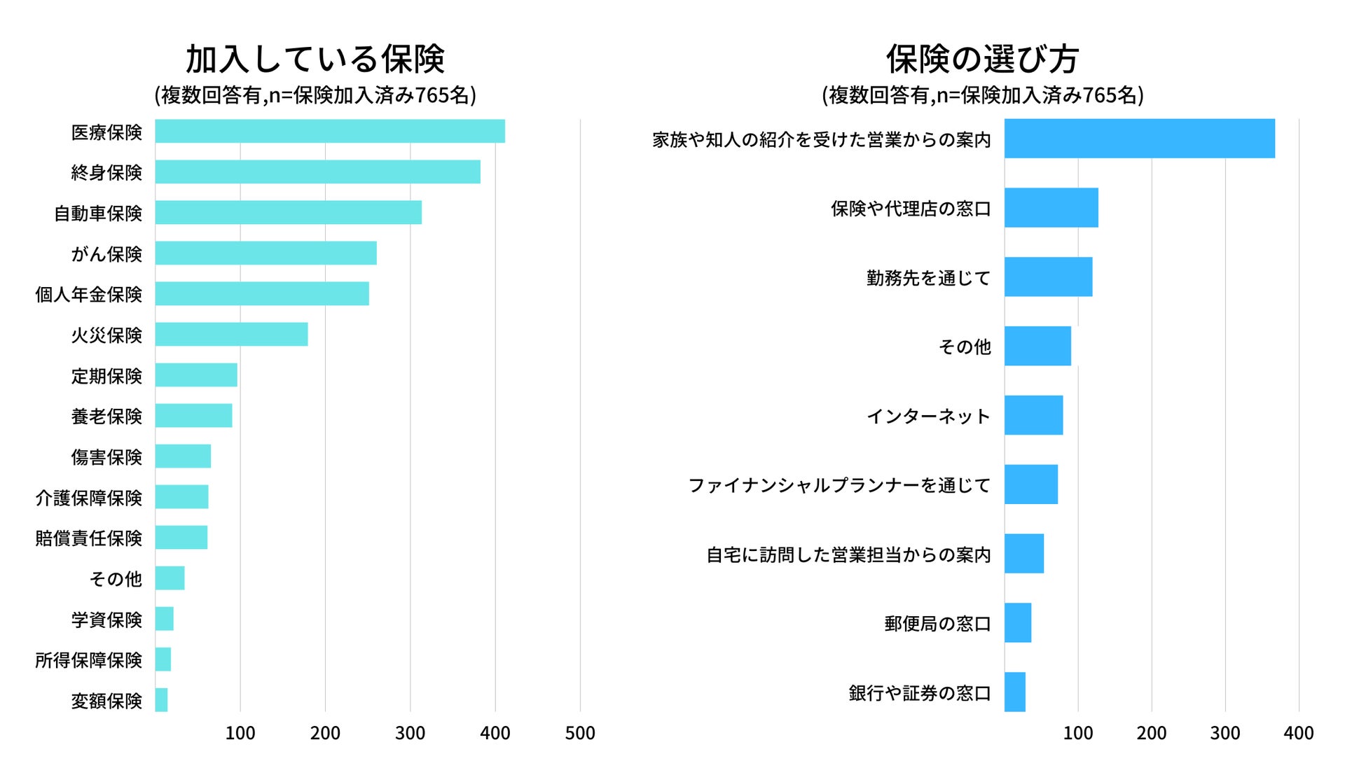 - 保険に加入している人の中で最も多く加入している商品は「医療保険」。保険選びは家族や知人から。