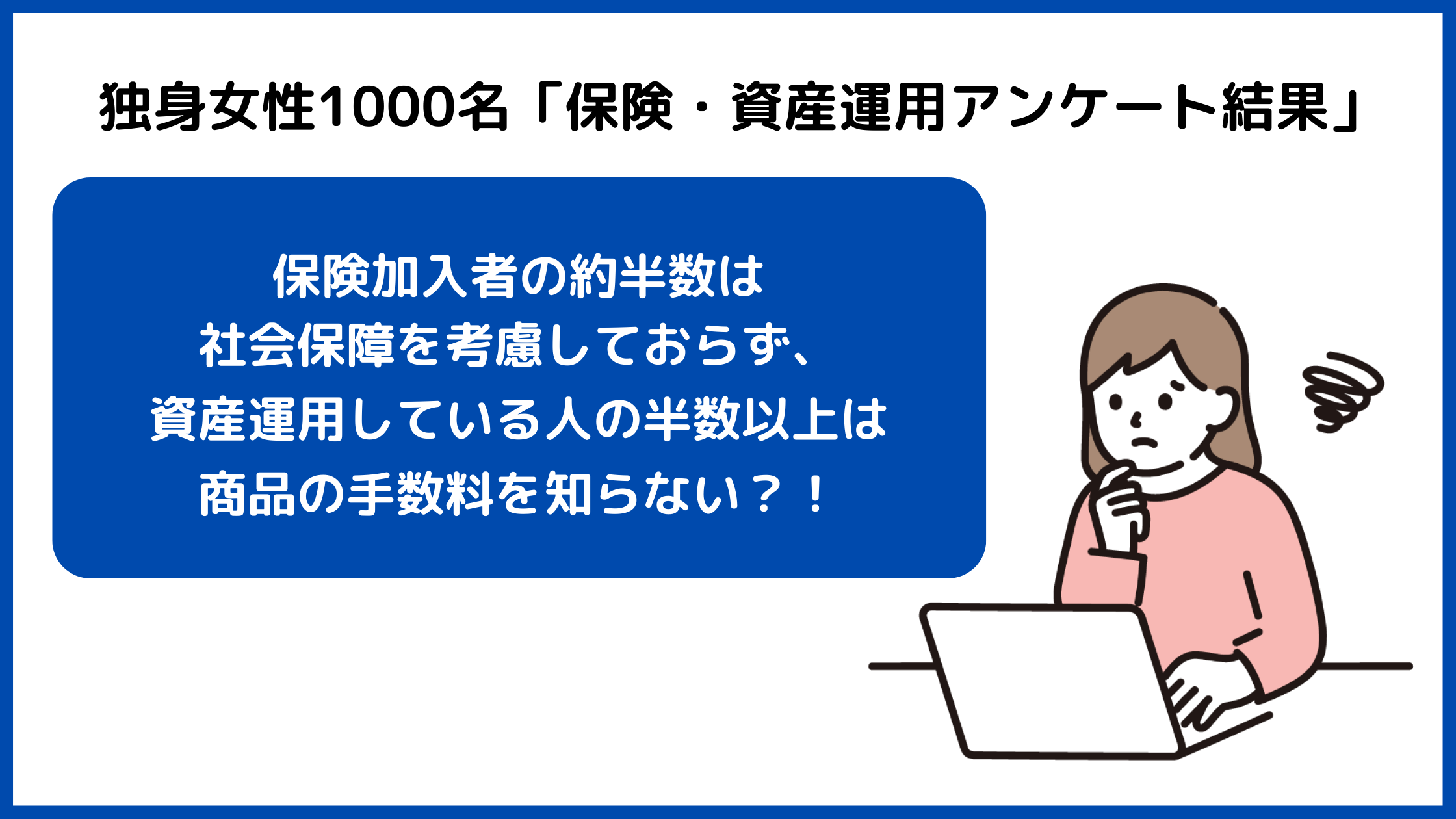 独身女性1000名に保険と投資に関する調査結果!保険加入者の約半数は社会保障を考慮しておらず、資産運用している人の半数以上は商品の手数料を知らないという結果