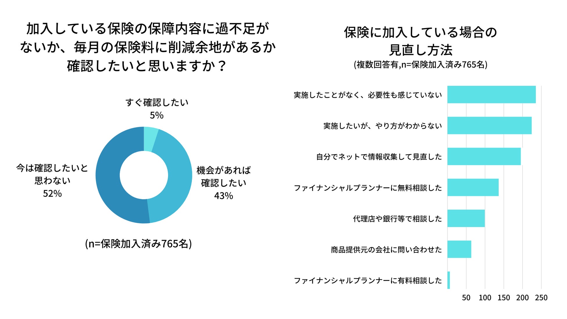 - 約半数が現在持っている保険の保障内容や保険料削減余地を確認したい。しかし、やり方がわからない人も多数。